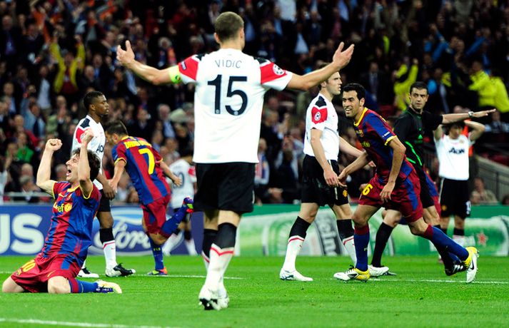 Barcelona með tvö mörk í seinni - myndir Óskar Ófeigur Jónsson skrifar 28. maí 2011 20:38 David Villa fagnar marki sínu sem innsiglaði sigurinn. Mynd/AP Barcelona tryggði sér sigur í Meistaradeildinni með sannfærandi 3-1 sigri á Manchester United í úrslitaleiknum á Wembley. Staðan var 1-1 í hálfleik en Barca tryggði sér sigurinn með mörkum frá Lionel Messi og David Villa í seinni hálfleiknum. Bæði mörkin þeirra Messi og Villa komu með skotum fyrir utan teig en þetta er í fyrsta sinn í úrslitaleik Meistaradeildarinnar sem sama lið skorar tvö mörk fyrir utan teig. AP-myndaþjónustan hefur þegar sent inn fullt af myndum úr leiknum og Vísir hefur tekið saman myndir af mörkum þeirra Messi og Villa. Myndirnar má sjá í albúminu hér að neðan. Hægt er að sjá myndirnar stærri með því að smella á þær. Meistaradeild Evrópu Mest lesið Líður alltaf yfir hana þegar hún kemur í mark Sport „Hefði séð eftir því alla ævi“ Íslenski boltinn „Mjög sáttur með samninginn“ Íslenski boltinn Scholes hættir og setur einhverfan son sinn í fyrsta sætið Enski boltinn „Hann ætti bara að skrifa afsökunarbiblíuna“ Körfubolti Rekinn fyrir ummæli sín um krabbameinssjúka handboltagoðsögn Handbolti Rúmar tvær milljónir í boði ef þú finnur hundinn hans Aarons Ramsey Fótbolti Hefur spilað 16 mínútur og fengið tvö rauð spjöld Enski boltinn Magnús Már í viðræðum við HK Íslenski boltinn Carrick í einkaviðtali: Sigurinn á Anfield stór stund fyrir Man. Utd Enski boltinn Fleiri fréttir Meistaradeildin skiptir um bjór og Heineken snýr sér að padel Aron Einar kominn á toppinn Tölur úr Bestu: Hallgrímur Mar bjó til langflest færi Fantasýn: „Þessi vörn er eitthvað skrímsli“ Scholes hættir og setur einhverfan son sinn í fyrsta sætið Rúmar tvær milljónir í boði ef þú finnur hundinn hans Aarons Ramsey Carrick í einkaviðtali: Sigurinn á Anfield stór stund fyrir Man. Utd Hefur spilað 16 mínútur og fengið tvö rauð spjöld Bættu Evrópumet AC Milan liðsins með Gullit og Van Basten innanborðs Slot: Engin auka pressa við þetta tap Real Madrid vill stórar skaðabætur frá UEFA „Mjög sáttur með samninginn“ „Hefði séð eftir því alla ævi“ Magnús Már í viðræðum við HK Bað alla nema þjálfarann afsökunar Vísar slúðrinu til föðurhúsanna Ísak Bergmann lagði upp gegn Bayern „Við tókum bara þá ákvörðun að fara í Svanavatnið“ Albert og Mikael Egill í vondum málum á Ítalíu Palace neitar að sleppa takinu á Liverpool „Eitthvað sem ég mun aldrei gleyma“ Einkunnir Íslands: Þrjár heitastar í frostinu Viktor Bjarki skoraði og lagði upp í fyrsta byrjunarliðsleiknum Uppgjörið: Ísland - Norður-Írland 3-0 | Áfram hluti af elítunni Pedri gæti verið frá keppni til langs tíma Arteta fyrstur stjóranna á fætur Þorsteinn breytir engu á milli leikja Snjóbræðslukerfi Þróttar kom KSÍ til bjargar Tölur úr Bestu 2025: Klúðraði langflestum dauðafærum í sumar Segja spurningar vakna um stöðu Elísabetar Sjá meira