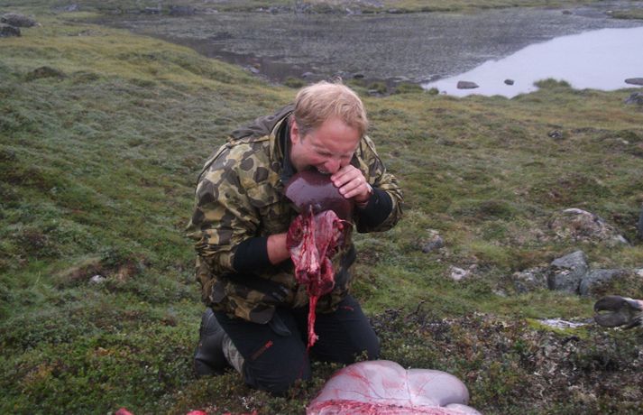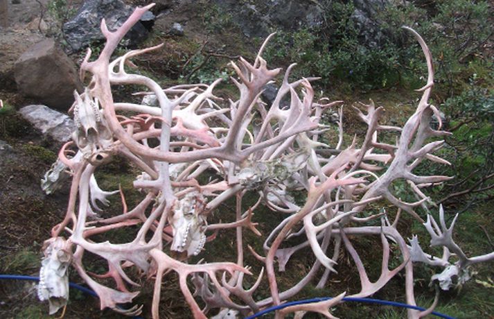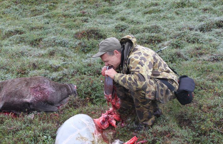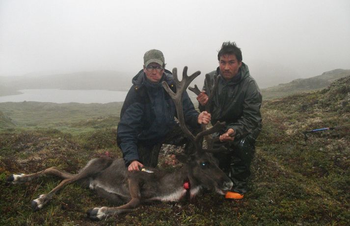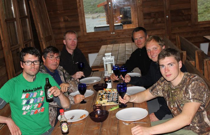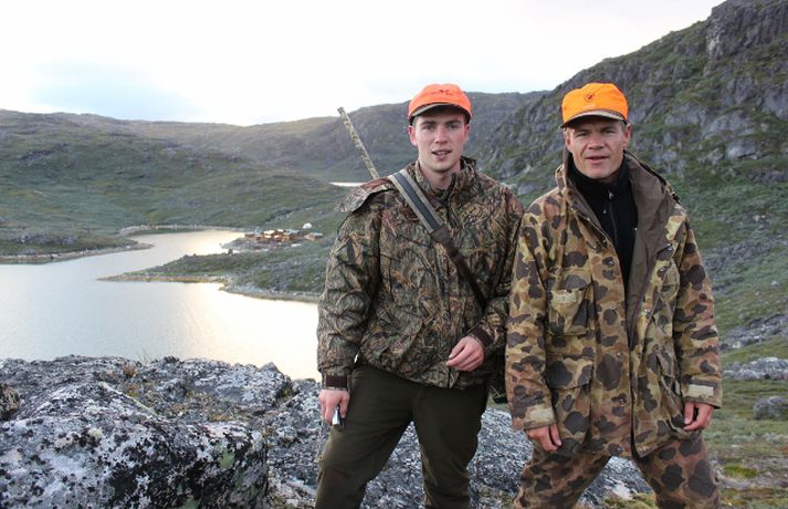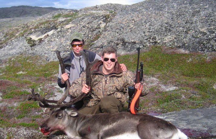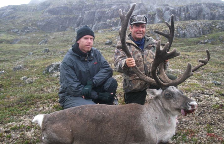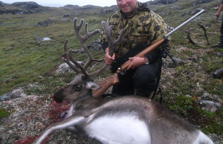 Grasið er grænna á Grænlandi 19. ágúst 2012 14:22 Sex manna hópur Íslendinga lagði upp í veiðiferð til Grænlands þar sem hreindýratarfar voru skotnir og rennt fyrir sprækar sjóbleikjur. Þórður Örn Kristjánsson, sem ætti að vera einhverjum lesendum Veiðivísis að góðu kunnur, segir hér sögu ferðalanganna og birtir nokkrar myndir með. Að fara til Grænlands til veiða hafði verið á dagskrá okkar feðga í fleiri ár en Ólafur Ragnar hefur setið sem forseti og loksins var komið að því að setjast upp í vél. Það voru því sex mjög spenntir veiðimenn sem lentu í Narsassuaq í dumbungsveðri þriðjudaginn 7. ágúst eftir þriggja tíma flug. Hópurinn samanstóð af Kristjáni Þórðarsyni augnlækni ásamt sonum sínum tveim þeim Þórarni Má háskólanema og mér, Þórði Erni fuglafræðingi. Einnig voru tengdasynir Kristjáns þeir Örnólfur Þorvarðarson HNE læknir og Bjarni Pálsson verkfræðingur með í för svo bættist Þórarinn Kristmundsson æðaskurðlæknir í Sverige og náfrændi okkar í hópinn. Menn voru því öruggir ef þeir potuðu í augun á sér, fengu hálsbólgu eða æðahnúta af allri gleðinni sem beið okkar á veiðisvæðinu. Siglt er frá Narsassuaq til Narsaq sem er smábær þar sem hægt er að kaupa vistir á uppsprengdu verði enda allt reiknað í dönskum krónum á Grænlandi. Grænmetisdeildin samastóð af 3 skemmdum agúrkum og fimm bönunum sem við keyptum, einnig fundust einhverskonar danskar pulsur og sauðnautahamborgarar sem enduðu í körfunni annars völdum við mest þurrmat enda ætlunin að veiða sér fisk til matar. Eftir innkaup var svo siglingunni haldið áfram í tæpa þrjá tíma í þægilegum bát í veiðibúðir Lax-á. Veðrið var blautt og óspennandi en vel var tekið á móti okkur af ráðsmanninum Óla og konu hans sem sáu um svæðið. Strax var haldið í næstu á til bleikjuveiða þótt tveir tímar væru til myrkurs. Fyrsta eiginlega veiðidag vorum við sóttir af grænlenskum gæd sem sigldi með okkur til móts við Stefán hreindýrabónda en þeir skiptu hópnum svo þrjár skyttur voru á hvern gæd. Ólíkt okkar hreindýraveiðum fer öll leit fram á bátum sem siglt er um firði og skimað eftir dýrum þegar dýr eru fundinn hefst eftirför þar sem þau eru furðu stygg. Sáum við heilmarga smáa hópa þótt skyggni væri ekki mikið og eftir nokkrar misheppnaðar eftirfarir komumst við loks í færi við fallega tarfa sem Þórarinn bróðir og pabbi felldu. Hinn hópurinn náði ekki að fella dýr þrátt fyrir nokkur tækifæri en landslag er þannig að svæðið er oftar en ekki mjög hæðótt og því færin þröng. Eftir veiðidag var haldið í bleikjuna og nú í nýjan hyl sem gjörsamlega kraumaði af fiski milli 2-5 pund. Hinir ýmsu streamerar gáfu vel og fékk þurrflugan einnig nokkur tækifæri enda veðrið orðið stórfenglegt. Megninu var sleppt en nokkrir voru þó drepnir og grillaðir um kvöldið. Annar veiðidagur var blautur og kaldur framan af en veður á Grænlandi breytist ótrúlega hratt og sólskinstundir eru (samkvæmt heimamönnum) allsráðandi yfir sumartímann og fram á haust. Það lægði og birti til um hádegið og þá voru þrír tarfar felldir úr sjö dýra hóp, allir hálsskotnir sem er venjan á Grænlandi til að minnka kjötskemmdir. Voru þessir tarfar fyrstu hreindýrin sem Bjarni, Össi og Tóti frændi felldu og því var vígslubitinn úr lifrinni tekinn eins og er til siðs hjá íslenskum villimönnum. Talsverðan tíma tók að hluta þessi dýr niður og drösla þeim í bátinn og hitinn þá orðinn mikill svo menn voru þreyttir og sveittir eftir átökin. Nú átti ég eftir síðasta dýrið og þokan aftur lögst yfir fjöllin og hlíðarnar. Fundum þó nokkuð myndarlega hjörð um 40 dýr og þar var einn mjög stór og ljós tarfur sem við gædinn og Tóti frændi eltum upp í þokuna. Loks fannst tarfurinn og var felldur á 200 metrum með hálskoti enda SAUR-inn vel stilltur og S&B kíkirinn að gera sitt. Það sama verður þó ekki sagt um glöggskyggni skyttunar eða gædsins þar sem þetta reyndist „rangur" tarfur og var mun minni og dekkri en sá sem við vorum að elta. Fallegt dýr engu að síður og skemmtilegt veiðimóment. Þar með voru öll hreindýr fallinn og menn farnir að hugsa sér gott til gufunnar sem beið okkar heit í veiðibúðunum. Eftir heita sturtu og frábæra gufuferð tók við sushigerð þar sem nýveiddar bleikjur úr ánni voru nýttar og slegið upp veislu. Dagur þrjú á veiðum var tekinn snemma og í stað hreindýrarifflana voru veiðistangir í forgrunni enda haldið til bleikjuveiða. Höfðum við samt alltaf með okkur allavega eina haglabyssu eða riffil þegar farið var í bleikju ef ske kynni að ísbjörn væri á svæðinu. Það gengur víst betur að fæla þá með skoti en fluguköstum. Eftir 6 tíma bleikjustreð fórum við í heimsókn til Stefáns hreindýrabónda en hann býr um 50 mín siglingu frá veiðibúðunum og rekur eina sláturhúsið í heiminum sem hefur leyfi til sölu á kjöti til bæði Ameríku og Evrópu skildist mér. Mjög flott aðstaða og fengum við þar hver fyrir sig 10 kg af hreindýrakjöti til innflutnings. Kvöldið leið við mat og drykk en menn voru þreyttir eftir allt púlið síðustu daga og því farið snemma í háttinn (eftir gufuferð að sjálfsögðu). Heimferðadagur var heiðskýr og blankalogn, ísjakar um allan sjó ásamt selum settu svip sinn á siglinguna til Narsassuaq en þar áttum við pantaða flugferð til Reykjavíkur. Aðstaðan sem Lax-á hefur komið upp á Grænlandi er án efa fyrsta flokks. Vatnsklósett, heitar sturtur, gufubað, grillaðstaða, eldavélar og góð rúm er eitthvað sem maður bjóst ekki við í óbyggðum Grænlands. Svæðið er í algjörri einangrun og líkurnar á að rekast á ferðamenn eða aðra veiðim
