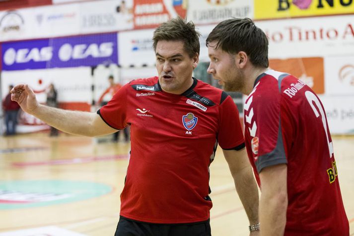 Haukar héldu áfram sigurgöngu sinni í N1-deild karla þegar þeir unnu vængbrotið lið Fram á útivelli 20-21. Haukar halda því yfirburðastöðu á topp deildarinnar en þeir þurftu svo sannarlega að hafa fyrir stigunum gegn sprækum Frömurum í kvöld. Flestir hafa sennilega búist við stórsigri gestana þegar liðin voru kynnt til leiks í kvöld. Jóhann Gunnar Einarsson, Sigurður Eggertsson og Róbert Aron Hostert voru allir fjarri góðu gamni í liði Fram og Haukar virtust eiga náðugan dag framundan. Ungir og sprækir leikmenn Fram voru ekki á þeim buxunum og gerðu reynslumiklu liði Hauka lífið leitt með mikilli baráttu og leikgleði. Haukar voru skrefinu á undan í fyrri hálfleik en nápu aldrei almennilega að stinga Framara af og munurinn aðeins tvö mörk í leikhléi, 8-10. Haukarnir byrjuðu síðari hálfleikinn af ágætum krafti, komust fjórum mörkum yfir, 12-16 og héldu þá flestir að björninn væri unninn. Heimamenn blésu á spekingana og skoruðu næstu þrjú mörk og leikurinn í járnum. Mikill darraðadans var stiginn á lokamínútum leiksins en það fór svo að Haukar fögnuðu eins marks sigri, 20-21 og geta í raun prísað sig sæla með punktana tvo. Undir lok leiksins fengu Haukar tvívegis frákast eftir varin skot Björns Viðars í marki Fram og óðagot í hraðaupphlaupi kostaði Framara mögulega eitt stig í kvöld. Haukarnir voru daprir og ekki ólíklegt að leikmenn hafi vanmetið lið Fram. Þeir náðu þó að kreista fram sigur og það einkennir góð lið, að vinna leiki þrátt fyrir slaka frammistöðu. Aron varði þokkalega í markinu en tók þrjú víti sem átti eftir að reynast dýrmætt. Jón Þorbjörn var traustur og Tjörvi kom sterkur inn í síðari hálfleik eftir dapran fyrri hálfleik. Hægt er að taka hattinn ofan fyrir Frömurum. Þeir börðust allt til loka og hefðu átt að taka stig í kvöld. Elías Bóasson og Ólafur Magnússon áttu báðir skínandi leik og Magnús varði vel í fyrri hálfleik. Þá átti reynsluboltinn Haraldur Þorvarðason flotta innkomu í síðari hálfleik. Aron Kristjánsson: Tvö stig það eina jákvæðaLandsliðs- og Haukaþjálfarinn Aron Kristjánsson var frekar brúnaþungur í leikslok þrátt fyrir sigur sinna manna. „Ég er alltaf að hamra á því að við erum bara slakir ef við mætum ekki tilbúnir og það var raunin í kvöld. Liðið fellur um 40-50% í getustigi við það að missa 10% af einbeitingunni." Aron var fljótur að svara því hvaða jákvæðu punkta hann tæki úr þessum leik „Stigin tvö, það er eiginlega það eina. Ágætis karakter að ná að klára þetta miðað við frammistöðuna en annars er ég ósáttur við leikinn." Daði Hafþórsson: Virkilega stoltur af liðinuDaði Hafþórsson stjórnaði liði Fram í fjarveru Einars Jónssonar sem tók út leikbann og hann var skiljanlega svekktur í leikslok. „Ég er stoltur af strákunum og mér fannst við eiga skilið eitthvað úr þessu miðað við framlag leikmanna." Daði var ósáttur við vítanýtingu sinna manna „Við klúðrum fjórum vítum og það er ástæðan fyrir því að þeir fara með tvö stig en ekki við." Stefán Rafn Sigurmannsson: Skelfilega lélegtStefán Rafn Sigurmannson var frekar daufur í leiknum og hann dró ekki fjöður yfir frammistöðu Hauka „Þetta var skelfilega lélegt hjá okkur og kannski spennufall eftir FH-leikinn. Við hendum frá okkur boltanum trekk í trekk, mjög slappt bara." Stefán vildi samt ekki draga úr frammistöðu Fram í leiknum „Við vissum að ef við myndum ekki mæta þeirra baráttu, myndum við lenda í vandræðum og það varð raunin. Þeir eiga hrós skilið fyrir góðan leik." Aðspurður hvort að hann væri að verða grófasti leikmaður deildarinnar en Stefán fékk tvisvar sinnum tveggja mínútna kælingu, svaraði hornamaðurinn knái „Þetta var hvorugt brot sem verðskuldaði tvær mínútur en þetta er bara svona, dómararnir meta þetta svona."