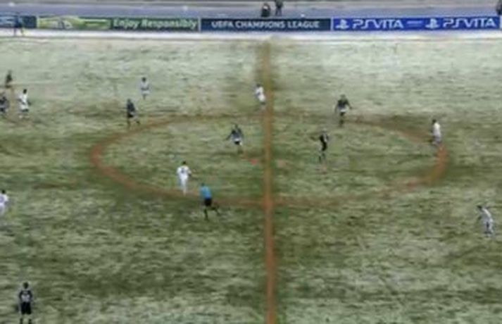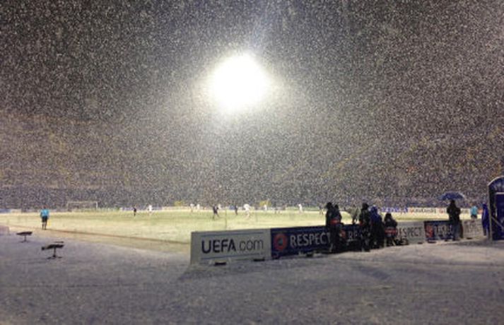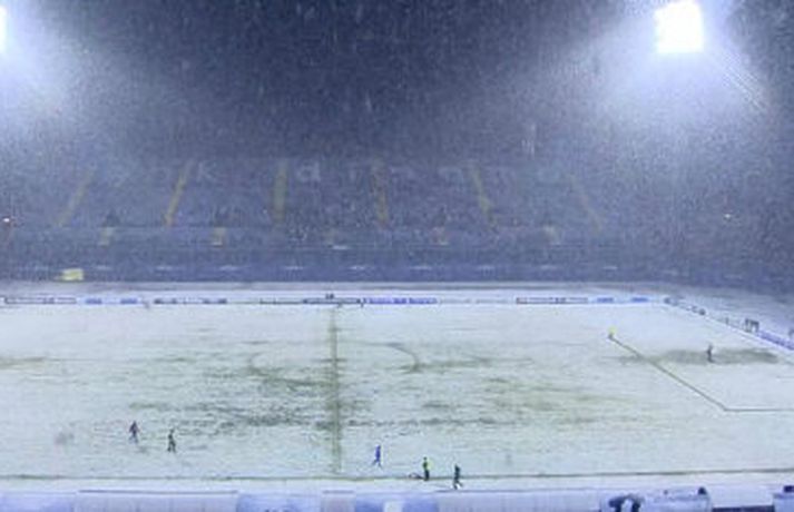 Stanislav Todorov, dómari frá Búlgaríu, stöðvaði leik Dinamo Zagreb og Dynamo Kiev í Meistaradeild Evrópu vegna snjókomu. Eftir að línur vallarins höfðu verið málaðar í rauðum lit var leik framhaldið. Todorov blés í flautu sína eftir níu mínútna leik og leiddi leikmenn liðanna af velli. Óvissa ríkti hvort leik liðanna yrði frestað en útlit er fyrir að leikið verði til þrautar. Leikur liðanna, sem eru ásamt Porto og PSG í A-riðli, er þýðingarlaus. Kænugarðsmenn hafa tryggt sér þriðja sæti riðilsins en heimamenn í Zagreb hafa ekki náð í stig og sitja á botni riðilsins.