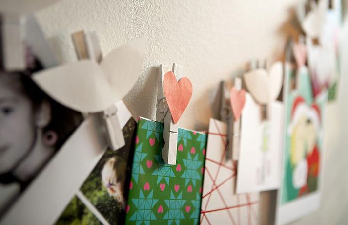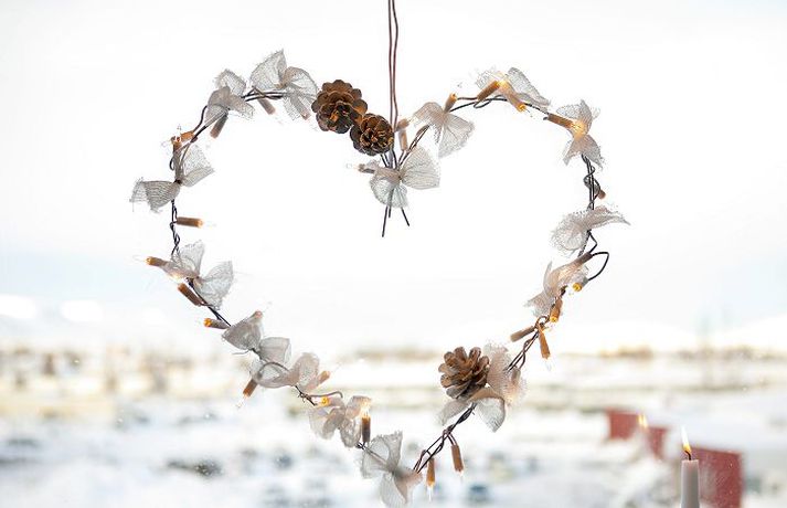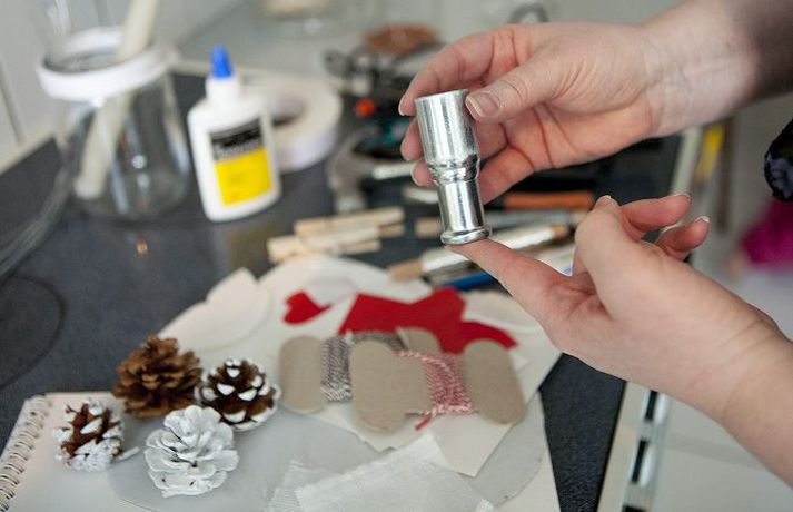 Guðrún Hilmisdóttir föndrar alltaf eitthvað fallegt fyrir hver jól. Nú bjó hún til sniðugan aðventukrans í blikkfötu, seríuhjarta og bráðskemmtilegar jólakortaklemmur sem einfalt er að föndra með börnum. Ég hlakka alltaf rosalega mikið til jólanna og föndra yfirleitt eitthvað," segir Guðrún Hilmisdóttir, grafískur hönnuður hjá hönnunar- og auglýsingastofunni Bleki á Akureyri. „Aðventukransinn reyni ég að gera á nýjan hátt fyrir hver jól og ég bý líka til jólakortin. Það hefur alltaf verið skreytt töluvert í mínum foreldrahúsum og ég elskaði allt jólaskrautið! Ég ólst ekki upp við mikinn glimmer eða glans, frekar bast, greni og köngla. Mig dreymdi um meiri glans og glimmer í þá daga en í dag kann ég betur að meta bastið og könglana," segir Guðrún hlæjandi. „Heima er skreytt á Þorláksmessukvöld og ég man eftir að hafa setið með mömmu og ömmu fram á nótt að búa til kertaskreytingar. Við systurnar skreyttum tréð einnig á Þorláksmessukvöld með mömmu eftir að pabbi hafði fest ljósin á. Ég held jólin enn heima hjá mömmu og pabba, en í dag er ég alfarið farin að sjá um tréð og enginn þorir að skipta sér af því lengur!" - ratAðventukrans í fötuBlikkfataBlómapottur sem kemst á hvolf ofan í fötunaKattasandur, hvíturPappaspjald – t.d. af pitsukassa4 „rörstykki" sem ég fékk í lagnadeild HúsasmiðjunnarKönglarHnetur, blandaðar og enn í skelinniLitlar greinarEfni í smá slaufuBlómavír eða föndurvírGott lím, t.d. „double-sided foam tape"Hvít málningDúkahnífur Hvolfið blómapotti ofan í blikkfötuna og fyllið upp að botninum með katta-sandi. Klippið til pappaspjald þannig að það passi sem best í fötuna þegar það liggur ofan á pottinum. Festið litlu rörin ofan á pappaspjaldið með límbandinu eða góðu lími þannig að víðara opið snúi upp. Fyllið aftur í kring með sandinum þannig að rörin standi vel upp úr og það sé enn gott pláss fyrir hnetur og köngla efst. Stingið grein niður með hliðinni, best að smeygja henni meðfram pappaspjaldinu svo að hún haldist föst. Setjið köngla, lifandi greni eða anísstjörnu ofan á til skrauts.SeríuhjartaGalvaníseraður vírVírtöng – ath. þarf að vera með klippu35 ljósa sería í lykkjuFöndurvírKönglarHvít málningStíft blúnduefni eða breiður borðiSkæri Klippið u.þ.b. tveggja metra langan vírbút og brjótið saman í tvennt um miðju, bindið saman á 2-3 stöðum með föndurvír svo að þeir haldist saman. Mótið hjarta og bindið aftur saman með föndurvír. Finnið miðjuna á seríunni og bindið hana neðst á hjartað með föndurvír. Ljósin í sitthvorum endanum á seríunni eru svo fest sitthvorum megin efst á hjartanu. Vefjið seríuna utan um vírinn og festið með föndurvír á örfáum stöðum. Festið köngla með föndurvír. Klippið nokkuð stíft blúnduefni eða borða niður í ferninga, u.þ.b. 10x10cm. Rykkið ferningana saman um miðjuna og bindið með föndurvír svo úr verður slaufa. Festið slaufurnar hér og þar á hjartað.JólakortasnúraBakarabandTréklemmurHvítur pappírRauður pappírLímbyssa eða gott föndurlím Málið klemmurnar hvítar. Klippið út lítil hjörtu og vængi úr nokkuð þykkum pappír. Límið pappírshjörtun og vængina á klemmurnar. Búið til snúru úr tvöföldu bakarabandi og hengið á vegg. Festið svo jólakortin á snúruna með klemmunum!