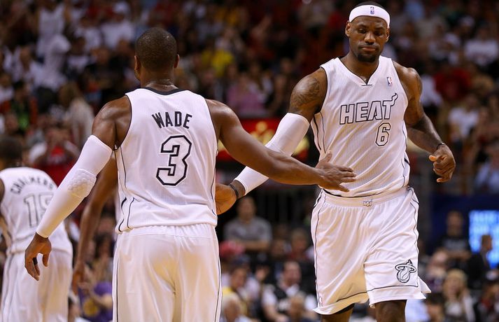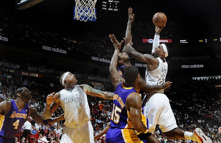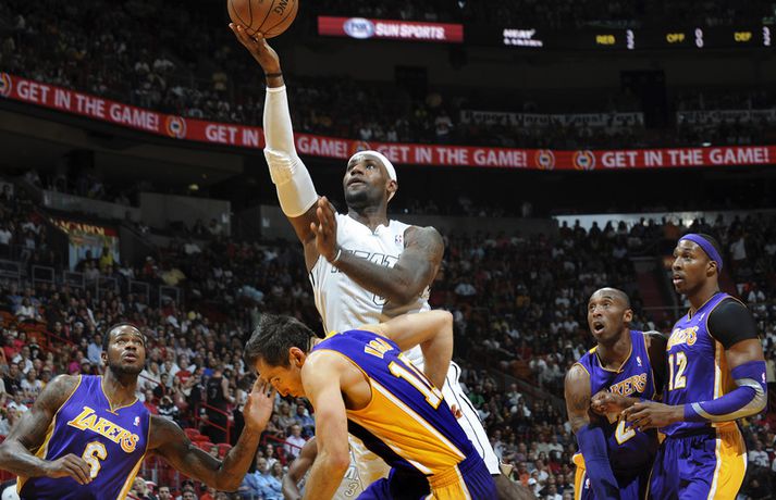 LeBron James hefur verið algjörlega óstöðvandi í síðustu leikjum með Miami Heat í NBA-deildinni í körfubolta eins og áhorfendur Stöðvar 2 Sport fengu að sjá í gær þegar James fór fyrir sigri Miami á móti Kobe Bryant og félögum í Los Angeles Lakers. LeBron James hefur nú verið með 30 stig og að minnsta kosti 60 prósent skotnýtingu í síðustu fimm leikjum sínum. Hann er aðeins þriðji maðurinn í sögu NBA til að ná því (Moses Malone með Houston 1981-82 og Adrian Dantley með Utah 1979-80) og ennfremur fyrsti maðurinn í sögu Miami Heat til að brjóta 30 stiga múrinn í fimm leikjum í röð. LeBron hefur nýtt 71,4 prósent skota sinna í þessum fimm leikjum en hann er þar með 84 prósent nýtingu inn í teig (37 af 44) og 60 prósent nýtingu fyrir utan þriggja stiga línuna (9 af 15). Dwyane Wade skoraði líka 30 stig og hitti úr 65 prósent skota sinna á móti Lakers og urðu þeir aðeins fjórðu liðsfélagarnir í sögu NBA-deildarinnar til þess að ná í því í sama leiknum. Hinir eru: Walt Bellamy og Gus Johnson (Bullets 1964), Alex English og Dan Issel (Denver Nuggets 1982), og Mike Miller og Pau Gasol (Memphis Grizzlies 2007).Síðustu fimm leikir LeBron James:100-85 sigur á Toronto - 30 stig, 8 fráköst, 7 stoðsendingar, 63 prósent skotnýting (10 af 16)99-94 sigur á Charlotte - 31 stig, 8 fráköst, 8 stoðsendingar, 93 prósent skotnýting (13 af 14)114-108 sigur á Houston - 32 stig, 6 fráköst, 5 stoðsendingar, 61 prósent skotnýting (11 af 18)111-89 sigur á LA Clippers - 30 stig, 5 fráköst, 6 stoðsendingar, 82 prósent skotnýting (9 af 11)107-97 sigur á LA Lakers - 32 stig, 7 fráköst, 4 stoðsendingar, 67 prósent skotnýting (12 af 18)