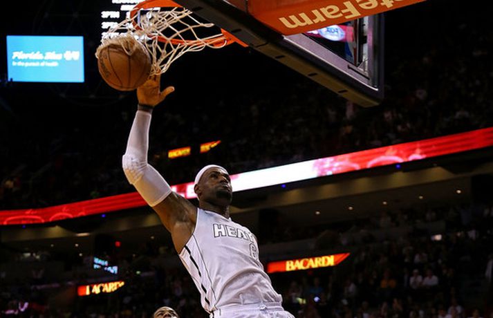 LeBron með 71 prósent skotnýtingu í síðustu fimm leikjum Óskar Ófeigur Jónsson skrifar 11. febrúar 2013 17:45 LeBron James. Mynd/Nordic Photos/Getty LeBron James hefur verið algjörlega óstöðvandi í síðustu leikjum með Miami Heat í NBA-deildinni í körfubolta eins og áhorfendur Stöðvar 2 Sport fengu að sjá í gær þegar James fór fyrir sigri Miami á móti Kobe Bryant og félögum í Los Angeles Lakers. LeBron James hefur nú verið með 30 stig og að minnsta kosti 60 prósent skotnýtingu í síðustu fimm leikjum sínum. Hann er aðeins þriðji maðurinn í sögu NBA til að ná því (Moses Malone með Houston 1981-82 og Adrian Dantley með Utah 1979-80) og ennfremur fyrsti maðurinn í sögu Miami Heat til að brjóta 30 stiga múrinn í fimm leikjum í röð. LeBron hefur nýtt 71,4 prósent skota sinna í þessum fimm leikjum en hann er þar með 84 prósent nýtingu inn í teig (37 af 44) og 60 prósent nýtingu fyrir utan þriggja stiga línuna (9 af 15). Dwyane Wade skoraði líka 30 stig og hitti úr 65 prósent skota sinna á móti Lakers og urðu þeir aðeins fjórðu liðsfélagarnir í sögu NBA-deildarinnar til þess að ná í því í sama leiknum. Hinir eru: Walt Bellamy og Gus Johnson (Bullets 1964), Alex English og Dan Issel (Denver Nuggets 1982), og Mike Miller og Pau Gasol (Memphis Grizzlies 2007).Síðustu fimm leikir LeBron James:100-85 sigur á Toronto - 30 stig, 8 fráköst, 7 stoðsendingar, 63 prósent skotnýting (10 af 16)99-94 sigur á Charlotte - 31 stig, 8 fráköst, 8 stoðsendingar, 93 prósent skotnýting (13 af 14)114-108 sigur á Houston - 32 stig, 6 fráköst, 5 stoðsendingar, 61 prósent skotnýting (11 af 18)111-89 sigur á LA Clippers - 30 stig, 5 fráköst, 6 stoðsendingar, 82 prósent skotnýting (9 af 11)107-97 sigur á LA Lakers - 32 stig, 7 fráköst, 4 stoðsendingar, 67 prósent skotnýting (12 af 18) NBA Mest lesið Grafalvarleg staða: „Þurfum að fara í sársaukafullar aðgerðir“ Handbolti Ógeðslega erfitt og ógeðslega vont en brosir oft í viku á eftir Sport Fram þvertekur fyrir metnaðarleysi og leitar að nýjum þjálfurum Íslenski boltinn „Nú er nóg komið“ Fótbolti Nefna greinar Íslandsmótsins í CrossFit í höfuðið á íslenskum íþróttakonum Sport Skortir Liverpool breidd þrátt fyrir gríðarleg fjárútlát síðasta sumar? Enski boltinn Arnór Snær snýr aftur heim Handbolti Besta handboltadeild heims missir aðalstyrktaraðila sinn Handbolti Gísli semur við Skagamenn Íslenski boltinn Félagið í greiðslustöðvun en borgaði öll laun degi fyrr Enski boltinn Fleiri fréttir „Við þurfum að vera betri varnarlega“ Íslenski körfuboltinn og Grindavík verðlaunuð NBA-leikmaður með krabbamein Haukur Helgi: Höfum ekki verið að spila góðan körfubolta „Getum verið fjandi góðir“ Uppgjörið: Álftanes-Njarðvík 93-92 | Heitur Haukur var hetjan á Álftanesinu Uppgjörið: Keflavík - Þór Þ. 86-82 | Þarf ekki alltaf að vera fallegt ef það virkar „Varnarleikur snýst eiginlega bara um að nenna“ Uppgjörið: Valur - Grindavík 55-90 | Taplausir Grindvíkingar kjöldrógu Val „Búnir að sýna hvað við getum verið lélegir“ KR - ÍA 109-75 | KR-ingar sýndu allar sínar bestu hliðar þegar þeir burstuðu Skagamenn Íslandsmeistararnir frá því fyrir sextíu árum heiðursgestir í kvöld „Hann ætti bara að skrifa afsökunarbiblíuna“ Uppgjörið: Njarðvík - Grindavík 85-84| Njarðvík fyrstar til að leggja Grindavík af velli Ótrúleg dramatík í Garðabæ og á Sauðárkróki Landsliðsmennirnir öflugir í Evrópu Jordan gagnrýnir álagsstjórnun í NBA: Þú hefur skyldu til að láta sjá þig Skiptiborð hjá stelpunum í kvöld Var með skattinn á hælunum þegar hann fór í veðmálabraskið Bíll Shaquille O'Neal enn ófundinn Martin öflugur í góðum sigri Öllum leikjum Bónus-deildar kvenna í kvöld frestað Stólarnir ekki í vandræðum á Egilsstöðum Enginn Lakers-maður hafði náð þessu í meira en 52 ár Veðmál rædd í Körfuboltakvöldi: „Bara ævintýralega heimskulegt“ Kvöddu húsið og Nablinn klifraði í kveðjuskyni Martin naut sín í fræknum sigri á meisturum Bayern Tryggvi lykilmaður í sigri Bilbao Elvar skoraði tólf í naumu tapi Tilþrifin: Varin skot og ótrúlegar körfur Valsmanna Sjá meira