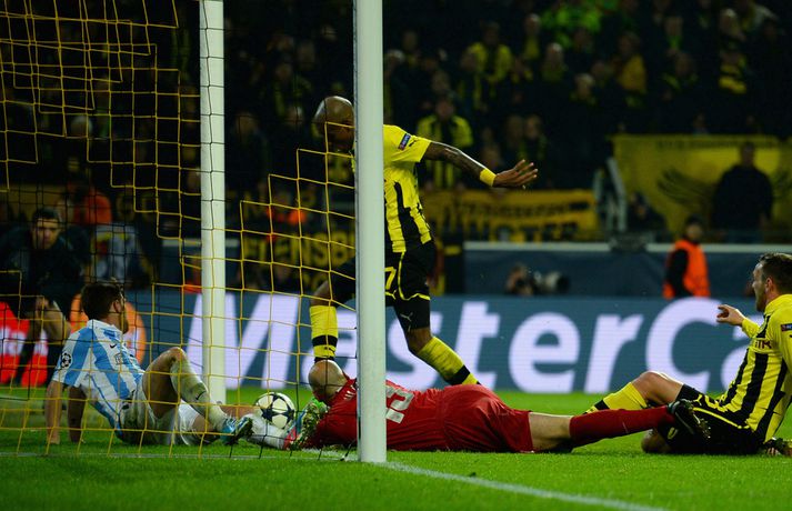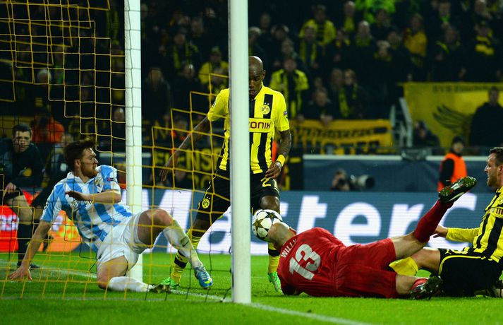 Dortmund skoraði tvö í uppbótartíma og komst áfram Eiríkur Stefán Ásgeirsson skrifar 9. apríl 2013 14:38 Nordicphotos/Getty Dortmund komst áfram í undanúrslit Meistaradeildar Evrópu eftir hádramatískan sigur á spænska liðinu Malaga á heimavelli í kvöld. Malaga var yfir, 2-1, þegar venjulegur leiktími rann út. Dortmund þurfti því tvö mörk og það tókst innan næstu þriggja mínútuna. Marco Reus skoraði fyrst og varnarmaðurinn Felipe Santana reyndist svo hetja þýska liðsins er hann skoraði sigurmarkið með því að ýta boltanum yfir línuna af mjög stuttu færi. Fimm dómurum leiksins yfirsást á einhvern ótrúlegan hátt sú staðreynd að Santana var kolrangstæður. Síðara mark Malaga var þó einnig rangstaða og mætti segja að mistök dómarakvintettsins hafi jafnast út. Ótrúlegur viðsnúningur á leiknum því á 82. mínútu hafði Malaga komist yfir. Mikill fögnuður braust út í leikslok en gestirnir voru skiljanlega niðurbrotnir. Fyrirfram virtist Malaga eiga litla möguleika á sigri enda hafði Dortmund unnið alla heimaleiki sína í Meistaradeildinni og verið í góðu formi í þýsku úrvalsdeildinni. Malaga var einnig án tveggja sterkra varnarmanna sem voru í leikbanni. En Spánverjarnir komust svo yfir um miðjan fyrri hálfleikinn þegar að Joaquin átti fínt skot að marki úr erfiðri stöðu rétt utan vítateigs. Þar sem fyrri leiknum lauk með jafntefli var ljóst að Dortmund þurfti þá tvö mörk til að komast áfram í undanúrslitin. Jöfnunarmarkið kom á 39. mínútu en þar var Robert Lewandowski að verki eftir glæsilegan undirbúning Marco Reus. Hann átti sendingu inn fyrir vörn gestanna með lúmskri hælsendingu og eftirleikurinn var einfaldur fyrir Pólverjann öfluga. Bæði lið fengu ágæt færi í upphafi síðari hálfleiks sókn Dortmund þyngdist eftir því sem leið á leikinn. Lewandowski skoraði mark var var réttilega dæmt af vegna rangstöðu. Reus og Mario Götze fengu svo dauðafæri með stuttu millibili en í bæði skiptin náði Willy, markvörður Malaga, að bjarga á undraverðan hátt. Markið lá í loftinu fyrir þá þýsku en þá komst Malaga í skyndisókn. Julio Baptista sendi boltann inn að marki og Eliseu ýtti boltanum yfir línuna af stuttu færi. Eliseu tók mikla áhættu með því að koma við boltann sem virtist hvort eð er á leiðinni í markið. Endursýningar í sjónvarpi sýndu svo að hann var rangstæður og hefði markið því átt vera dæmt ógilt. Malaga virtist vera með unna stöðu en Þjóðverjarnir gáfust ekki upp og unnu sem fyrr segir undraverðan sigur.Sportið á Vísi er komið á Facebook. Fylgstu með. Meistaradeild Evrópu Tengdar fréttir "Einstakt tækifæri" Malaga sækir Dortmund heim í síðari viðureign liðanna í átta liða úrslitum Meistaradeildar Evrópu í knattspyrnu í kvöld. 9. apríl 2013 15:00 Mest lesið Vonast til að komast í Kórinn: „Menn hafa aldrei séð annað eins“ Fótbolti Fær þrjár milljónir á dag næstu sex árin fyrir að gera ekkert Sport Stöðufundur í Laugardal klukkan 10:30 Fótbolti Enska úrvalsdeildin í jólaköttinn Enski boltinn Elsta konan til klára Járnkarlinn Sport Markvörður Inter banaði háöldruðum manni í hjólastól Sport Nýi íþróttastjóri Kjartans stal mörgæs og endaði í fangelsi í Singapúr Fótbolti Brendan Rodgers sagði starfinu sínu lausu eftir ásakanir Fótbolti Landsleiknum aflýst og framhaldið óljóst Fótbolti Tyrkneska sambandið segir dómara hafa veðjað á þúsundir leikja Fótbolti Fleiri fréttir Landsleiknum aflýst og framhaldið óljóst Segir að Slot verði að taka tvo leikmenn út úr Liverpool-liðinu Vonast til að komast í Kórinn: „Menn hafa aldrei séð annað eins“ „Alltaf gaman að fá nýjar raddir inn“ Gleðifréttir fyrir Argentínumenn: Messi vill spila á HM Stöðufundur í Laugardal klukkan 10:30 Enska úrvalsdeildin í jólaköttinn Nýi íþróttastjóri Kjartans stal mörgæs og endaði í fangelsi í Singapúr Tyrkneska sambandið segir dómara hafa veðjað á þúsundir leikja Brendan Rodgers sagði starfinu sínu lausu eftir ásakanir Segir sitt fyrrum lið í krísu Fylltu í eyðurnar: Vanmetnasti leikmaður deildarinnar? Fyrirliði Real Madríd þarf að fara í aðgerð á hné Einkaviðtal við Carrick: „Hálfgerð tískubylgja sem einkennir fótboltann í dag“ Markaóður Stefán Ingi eftirsóttur Öllu búin skildi snjóspáin raungerast „Eitthvað sem við erum óvanar eftir Þjóðadeildina“ Heimir kynntur til leiks í Árbænum Danir heiðra Michael Laudrup De Bruyne verður lengi frá Túfa rekinn frá Val Fyrrum markmannsþjálfari Liverpool látinn Juventus rak þjálfarann eftir aðeins sjö mánuði „Mikilvægt fyrir hópinn að fá þessa sigurtilfinningu“ Besta liðið aðeins í sautjánda sæti í mörkum í opnum leik „Varnarleikurinn er bara stórslys“ Blaðamannafundur KSÍ: Þorsteinn og Glódís sátu fyrir svörum Guardiola: Of snemmt til að hafa áhyggjur af Arsenal Kennir Carvajal um lætin eftir El Clasico Setja fjórtán milljarða í kvennadeildina Sjá meira