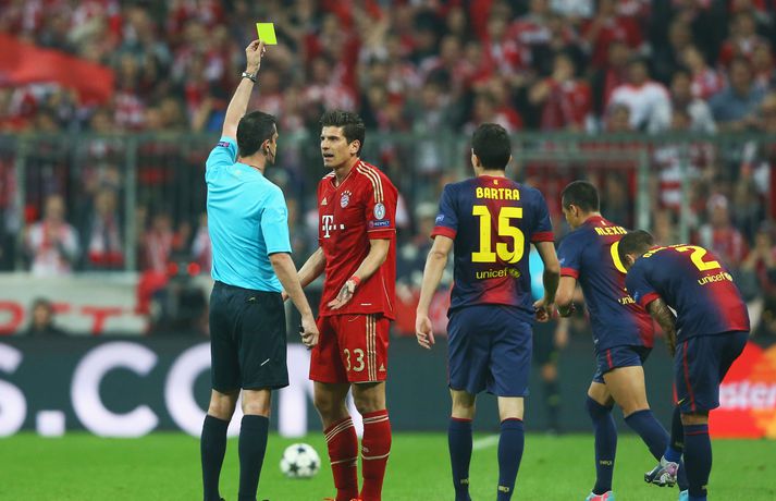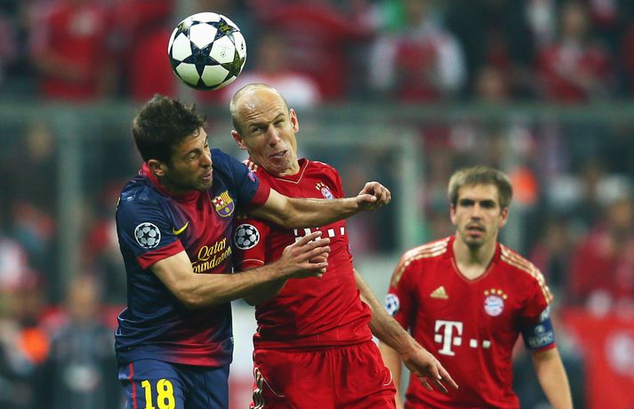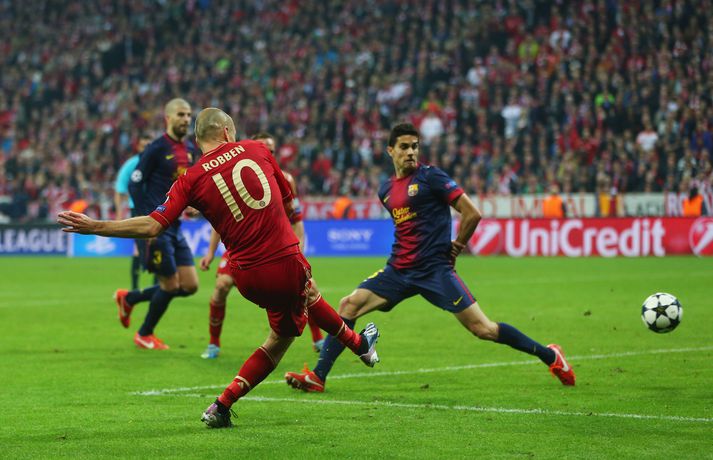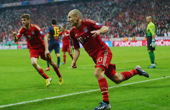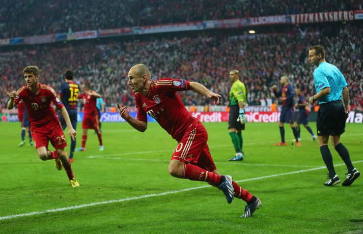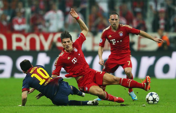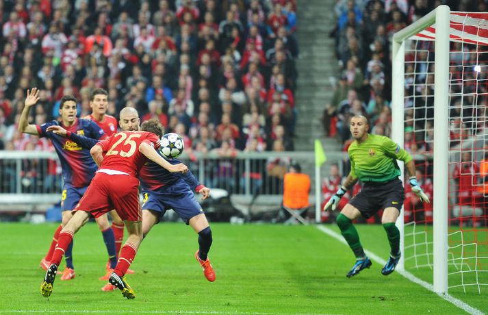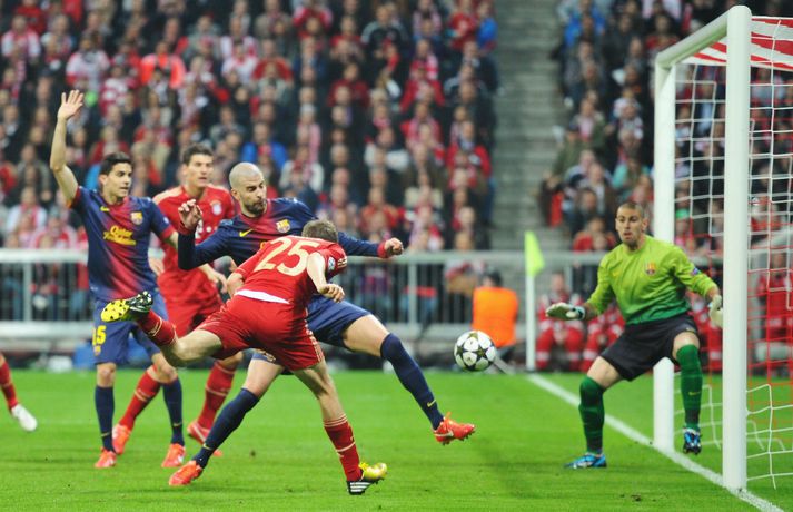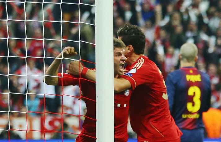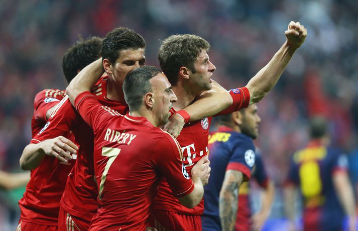 Fullkominn leikur hjá Bayern München 23. apríl 2013 08:48 Bayern fagnaði oft í kvöld og verður örugglega fagnað fram á nótt. Þýska liðið Bayern München bauð til veislu á Allianz-vellinum í kvöld er liðið kjöldró hið stórkostlega lið Barcelona og vann ótrúlegan 4-0 sigur sem seint mun gleymast. Bayern er því komið með annan fótinn í úrslit Meistaradeildarinnar en þetta var fyrri leikur liðanna í undanúrslitum keppninnar. Leikurinn byrjaði með miklum látum. Bæði lið sóttu af krafti og líf í leiknum. Fyrsta markið kom eftir 25 mínútna leik. Þá endaði þung sókn Bayern með því að Thomas Müller stangaði boltann í netið af stuttu færi. Þýska liðið byrjaði síðari hálfleikinn með látum. Robben tók horn sem flaug yfir á fjærstöng. Þar skallaði Müller boltann fyrir og Gomez mokaði honum yfir línuna. Gomez er mikil markamaskína og þá sérstaklega á heimavelli í Meistaradeildinni. Þetta var hans 15. mark í 14 leikjum á Allianz-vellinum. Veislunni var ekki lokið í Bæjaralandi því Arjen Robben skoraði mark úr þröngu færi eftir magnað einstaklingsframtak og Gomez bætti fjórða markinu við átta mínútum fyrir leikslok. Þetta var í fyrsta skipti síðan árið 2005 að Barcelona fær á sig fjögur mörk í Meistaradeildinni. Chelsea gerði það síðast. Stærsta tap Barcelona í Evrópukeppnum fyrir kvöldið var gegn Dynamo Kiev. Sá leikur endaði 4-0 og fór fram í nóvember árið 1997. Það vonda met var jafnað á þessu skelfilega kvöldi fyrir Barcelona. Leikmenn Bayern gátu aftur á móti leyft sér að fagna en þeir spiluðu hinn fullkomna leik. Meistaradeild Evrópu Mest lesið Óskar Hrafn fer ekki fet Íslenski boltinn Hákon Rafn hélt hreinu þegar Brentford flaug áfram Enski boltinn Spánn og Þýskaland mætast í úrslitum Fótbolti Anguissa hetja meistaranna Fótbolti Martin öflugur í góðum sigri Körfubolti Verstappen telur sig ekki geta barist um titilinn Formúla 1 Jón Dagur gulltryggði sigurinn með sínu fyrsta marki Fótbolti Leikið á Þróttaravelli á miðvikudag Fótbolti Segir að Slot verði að taka tvo leikmenn út úr Liverpool-liðinu Enski boltinn Birnir frá Akureyri í Garðabæ Íslenski boltinn Fleiri fréttir Óskar Hrafn fer ekki fet Spánn og Þýskaland mætast í úrslitum Anguissa hetja meistaranna Hákon Rafn hélt hreinu þegar Brentford flaug áfram Jón Dagur gulltryggði sigurinn með sínu fyrsta marki Leikið á Þróttaravelli á miðvikudag Vinícius Júnior íhugar að yfirgefa Real Madríd Kaupir sér tveggja milljarða króna hús Alexander Máni með fimm mörk í tveimur leikjum og Ísland áfram Birnir frá Akureyri í Garðabæ Klobbaði íslensku strákana og fór á flug á netmiðlum Hættir með Fram Landsliðskonur aðstoðuðu ökumenn í vanda Landsleiknum aflýst og framhaldið óljóst Segir að Slot verði að taka tvo leikmenn út úr Liverpool-liðinu Vonast til að komast í Kórinn: „Menn hafa aldrei séð annað eins“ „Alltaf gaman að fá nýjar raddir inn“ Gleðifréttir fyrir Argentínumenn: Messi vill spila á HM Stöðufundur í Laugardal klukkan 10:30 Enska úrvalsdeildin í jólaköttinn Nýi íþróttastjóri Kjartans stal mörgæs og endaði í fangelsi í Singapúr Tyrkneska sambandið segir dómara hafa veðjað á þúsundir leikja Brendan Rodgers sagði starfinu sínu lausu eftir ásakanir Segir sitt fyrrum lið í krísu Fylltu í eyðurnar: Vanmetnasti leikmaður deildarinnar? Fyrirliði Real Madríd þarf að fara í aðgerð á hné Einkaviðtal við Carrick: „Hálfgerð tískubylgja sem einkennir fótboltann í dag“ Markaóður Stefán Ingi eftirsóttur Öllu búin skildi snjóspáin raungerast „Eitthvað sem við erum óvanar eftir Þjóðadeildina“ Sjá meira