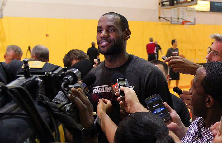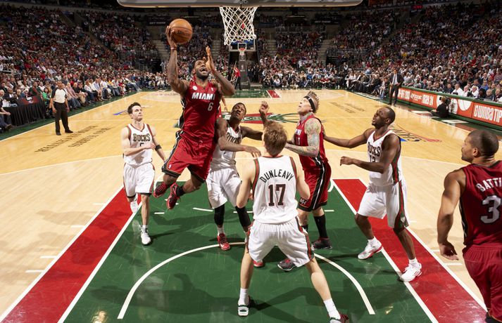 Bandarískir fjölmiðlar greindu frá því í nótt að LeBron James, leikmaður Miami Heat, hafi verið kosinn mikilvægasti leikmaður NBA-deildarinnar í körfubolta á þessu tímabili og nú er eina spennan hvort að hann hafi fengið fullt hús eða ekki. LeBron James er þar með aðeins fimmti leikmaðurinn í sögunni til að vinna þessi verðlaun fjórum sinnum en hinir í klúbbnum eru þeir Kareem Abdul-Jabbar, Michael Jordan, Bill Russell og Wilt Chamberlain. Ekki slæmur félagsskapur þar. Abdul-Jabbar er sá eini sem hefur eins og James náð því tvisvar sinnum að vera kosinn bestur tvö ár í röð. LeBron James er að vinna þessi verðlaun annað árið í röð og í fjórða sinn á fimm árum en hann fær verðlaunin afhent á morgun. Það hefur enginn fengið fullt hús í þessari kosningu blaðamanna sem fjalla um NBA-deildina en sumir spá því að það gæti gerst núna. James átti magnað tímabil með því liði sem náði langbestum árangri í deildarkeppninni. Hann var með 26,8 stig, 8,0 fráköst og 7,3 stoðsendingar að meðaltali í leik og hitti úr 56 prósent skota sinna. Miami vann 66 af 82 leikjum og þar á meðal 27 leiki í röð se er önnur lengsta sigurganga í sögu NBA-deildarinnar.