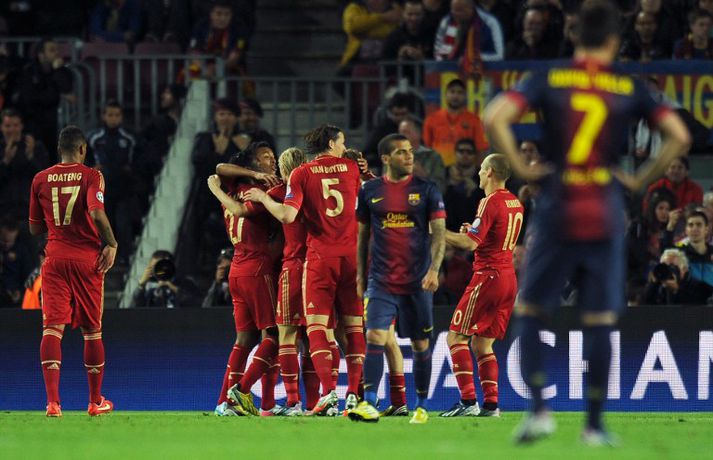 Bayern slátraði Barcelona og mætir Dortmund í úrslitum 1. maí 2013 12:51 Það var gaman að vera Bæjari á Nývangi í kvöld. Nordicphotos/AFP Bayern München vann 3-0 sigur á Barcelona í síðari leik liðanna í undanúrslitum Meistaradeildar Evrópu í knattspyrnu í kvöld. Bæjarar unnu spænska risann 7-0 samanlagt í tveimur leikjum. Lionel Messi var á varamannabekk Barcelona í kvöld sem veikti litla von heimamanna eftir niðurlæginguna í München fyrir viku. Strax frá upphafi varð ljóst að án töframannsins var möguleiki Börsunga á kraftaverki enginn. Ekkert mark var skorað í fyrri hálfleik en gestirnir reiddu til höggs snemma í síðari hálfleik. Arjen Robben skoraði þá glæsilegt mark og aftur fögnuðu Bæjarar á 72. mínútu þegar Gerard Pique skoraði sjálfsmark. Niðurlægingin var algjör fjórum mínútum síðar þegar Frank Ribery spólaði sig upp vinstri kantinn og sendi fyrir markið. Stórleikjamaðurinn Thomas Müller var mættur á fjærstöng og stangaði knöttinn í netið. Stuðningsmenn beggja lið klöppuðu Bæjurum lof í lófa enda engin spurning að betra liðið fór með sigur af hólmi. Samanlöguð úrslitin 7-0 eru eitthvað sem enginn í heiminum gat séð fyrir. Bayern München mætir Borussia Dortmund í úrslitaleik á Wembley þann 25. maí. Það verður í fyrsta skipti sem tvö þýsk lið mætast í úrslitum. Meistaradeild Evrópu Mest lesið Óskar Hrafn fer ekki fet Íslenski boltinn Hákon Rafn hélt hreinu þegar Brentford flaug áfram Enski boltinn Spánn og Þýskaland mætast í úrslitum Fótbolti Anguissa hetja meistaranna Fótbolti Martin öflugur í góðum sigri Körfubolti Verstappen telur sig ekki geta barist um titilinn Formúla 1 Jón Dagur gulltryggði sigurinn með sínu fyrsta marki Fótbolti Leikið á Þróttaravelli á miðvikudag Fótbolti Dagskráin í dag: Íslenskur körfubolti í sviðsljósinu Sport Segir að Slot verði að taka tvo leikmenn út úr Liverpool-liðinu Enski boltinn Fleiri fréttir Óskar Hrafn fer ekki fet Spánn og Þýskaland mætast í úrslitum Anguissa hetja meistaranna Hákon Rafn hélt hreinu þegar Brentford flaug áfram Jón Dagur gulltryggði sigurinn með sínu fyrsta marki Leikið á Þróttaravelli á miðvikudag Vinícius Júnior íhugar að yfirgefa Real Madríd Kaupir sér tveggja milljarða króna hús Alexander Máni með fimm mörk í tveimur leikjum og Ísland áfram Birnir frá Akureyri í Garðabæ Klobbaði íslensku strákana og fór á flug á netmiðlum Hættir með Fram Landsliðskonur aðstoðuðu ökumenn í vanda Landsleiknum aflýst og framhaldið óljóst Segir að Slot verði að taka tvo leikmenn út úr Liverpool-liðinu Vonast til að komast í Kórinn: „Menn hafa aldrei séð annað eins“ „Alltaf gaman að fá nýjar raddir inn“ Gleðifréttir fyrir Argentínumenn: Messi vill spila á HM Stöðufundur í Laugardal klukkan 10:30 Enska úrvalsdeildin í jólaköttinn Nýi íþróttastjóri Kjartans stal mörgæs og endaði í fangelsi í Singapúr Tyrkneska sambandið segir dómara hafa veðjað á þúsundir leikja Brendan Rodgers sagði starfinu sínu lausu eftir ásakanir Segir sitt fyrrum lið í krísu Fylltu í eyðurnar: Vanmetnasti leikmaður deildarinnar? Fyrirliði Real Madríd þarf að fara í aðgerð á hné Einkaviðtal við Carrick: „Hálfgerð tískubylgja sem einkennir fótboltann í dag“ Markaóður Stefán Ingi eftirsóttur Öllu búin skildi snjóspáin raungerast „Eitthvað sem við erum óvanar eftir Þjóðadeildina“ Sjá meira