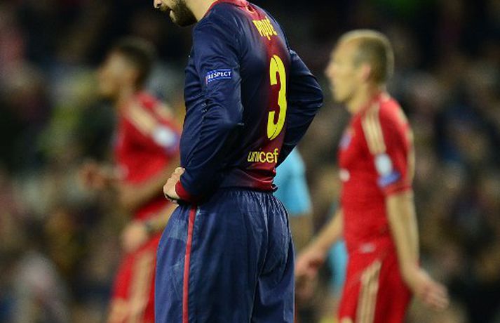 Bayern München vann 3-0 sigur á Barcelona í síðari leik liðanna í undanúrslitum Meistaradeildar Evrópu í knattspyrnu í kvöld. Bæjarar unnu spænska risann 7-0 samanlagt í tveimur leikjum. Lionel Messi var á varamannabekk Barcelona í kvöld sem veikti litla von heimamanna eftir niðurlæginguna í München fyrir viku. Strax frá upphafi varð ljóst að án töframannsins var möguleiki Börsunga á kraftaverki enginn. Ekkert mark var skorað í fyrri hálfleik en gestirnir reiddu til höggs snemma í síðari hálfleik. Arjen Robben skoraði þá glæsilegt mark og aftur fögnuðu Bæjarar á 72. mínútu þegar Gerard Pique skoraði sjálfsmark. Niðurlægingin var algjör fjórum mínútum síðar þegar Frank Ribery spólaði sig upp vinstri kantinn og sendi fyrir markið. Stórleikjamaðurinn Thomas Müller var mættur á fjærstöng og stangaði knöttinn í netið. Stuðningsmenn beggja lið klöppuðu Bæjurum lof í lófa enda engin spurning að betra liðið fór með sigur af hólmi. Samanlöguð úrslitin 7-0 eru eitthvað sem enginn í heiminum gat séð fyrir. Bayern München mætir Borussia Dortmund í úrslitaleik á Wembley þann 25. maí. Það verður í fyrsta skipti sem tvö þýsk lið mætast í úrslitum.