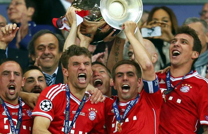 Philipp Lahm, fyrirliði Bayern München, lyfti nú áðan Meistaradeildarbikarnum á Wembley-leikvanginum í London eftir að liðið hans vann 2-1 sigur á Borussia Dortmund í úrslitaleiknum. Þetta er afar stór stund fyrir Philipp Lahm sem hafði tvisvar sinnum tapað úrslitaleik Meistaradeildarinnar á síðustu þremur árum. Philipp Lahm hefur verið í Bayern München síðan að hann var ellefu ára gamall og hefur verið fyrirliði liðsins frá 2011. Philipp Lahm er aðeins þriðji leikmaður Bayern München til að lyfta bikarnum með stóru eyrun því Franz Beckenbauer (1974, 1975 og 1976) og Steffen Effenberg (2001) eru þeir einu sem hafa staðið í sömu sporum í glæsilegri sögu þýska stórliðsins.