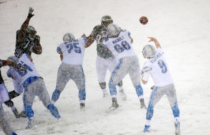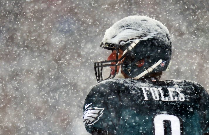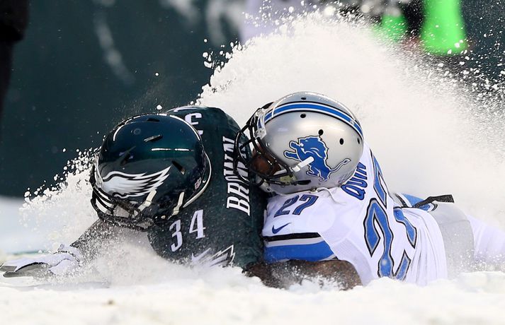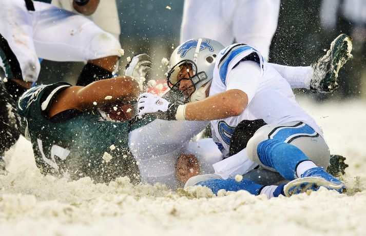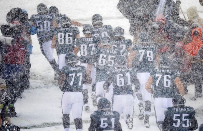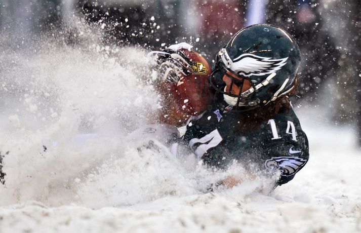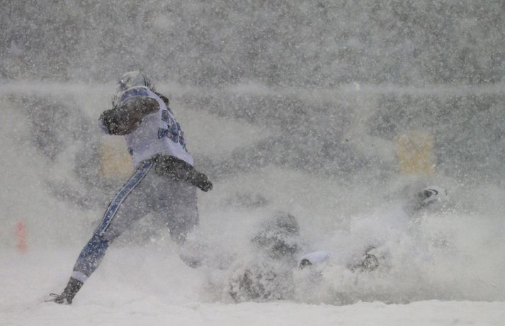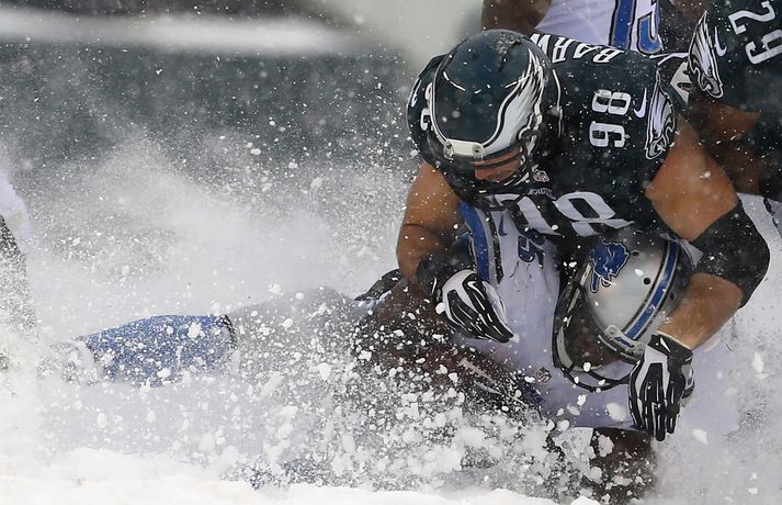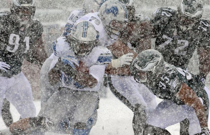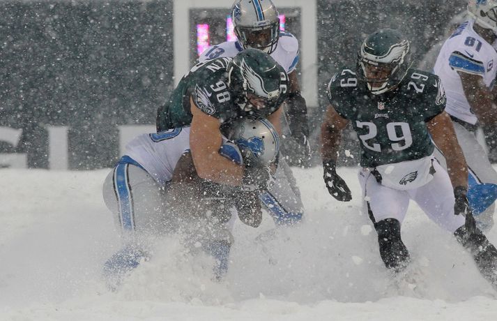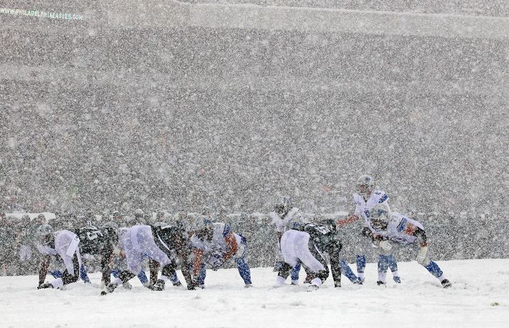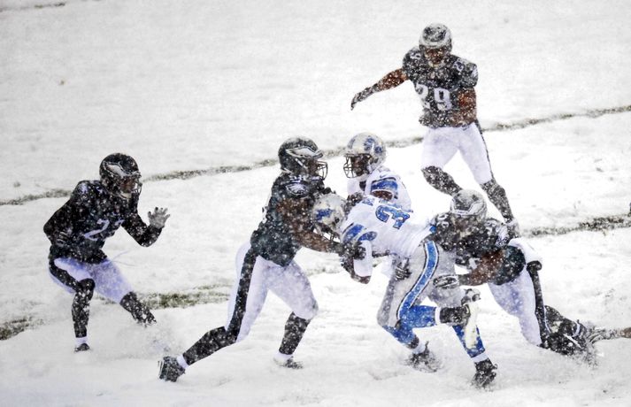 Það er spilað í NFL-deildinni alveg sama hvernig veðrið er. Því fengu leikmenn Philadelphia Eagles og Detroit Lions að kynnast í gær í eftirminnilegum leik. Það voru snjóskaflar á vellinum og snjónum kyngdi niður lungann úr leiknum. Svo mikil var snjókoman að vart sást inn á völlinn lengi vel og leikmenn áttu hreinlega erfitt með að fóta sig á vellinum. Leikmenn Philadelphia kunnu þó betur við sig í snjónum því þeir unnu sannfærandi sigur, 34-20. Magnaðar myndir úr þessum ótrúlega leik má sjá hér að ofan.nordicphotos/getty