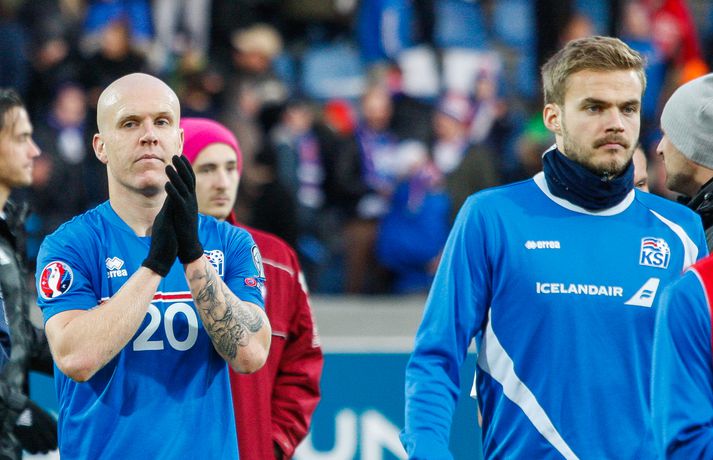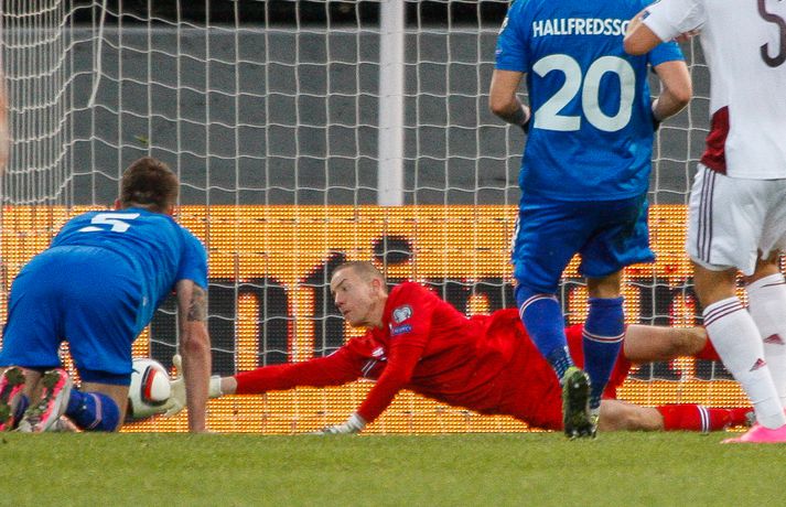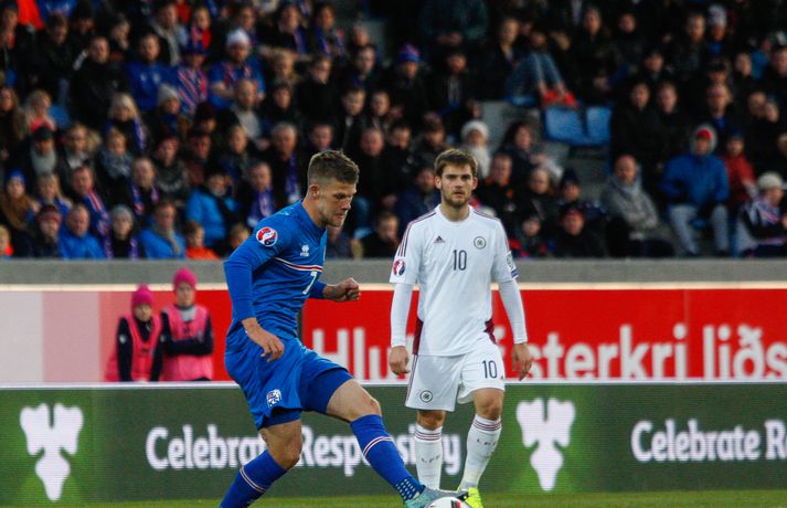 Umfjöllun, viðtöl, einkunnir og myndir: Ísland - Lettland 2-2 | Stefndi í veislu en jafntefli niðurstaðan Eiríkur Stefán Ásgeirsson og Kolbeinn Tumi Daðason skrifa 10. október 2015 18:00 Ragnar fagnar marki Kolbeins sem var hans átjánda fyrir A-landsliðið. Hann er nú næstmarkahæsti leikmaður landsliðsins frá upphafi. Vísir Lettar kipptu liprum íslenskum landsliðsmönnum niður á jörðina í 2-2 jafntefli liðanna í A-riðli undankeppni Evrópumótsins í knattspyrnu í Laugardalnum í dag. Okkar menn léku við hvurn sinn fingur framan af fyrri hálfleik, komust í 2-0 og stefndi í veislu. Lettar svöruðu fyrir sig með tveimur snyrtilegum mörkum í síðari hálfleik og var jafntefli að líkindum sanngjörn niðurstaða. Tvö stig töpuð og Tékkar geta tekið toppsæti riðilsins í kvöld með sigri gegn Tyrkjum.Sjá einnig:Einkunnir okkar manna gegn LettumLjósmyndarar Fréttablaðsins og Vísis, voru á vellinum og smelltu þessum skemmtilegu myndum sem sjá má hér fyrir ofan sem og fyrir neðan. Það var hrein unun að fylgjast með okkar mönnum fyrri hluta fyrri hálfleiks. Yfirburðirnir voru algjörir og tilþrifin og spil manna á milli til algjörrar fyrirmyndar. Kolbeinn skoraði af stuttu færi eftir aðeins fimm mínútur þegar Andris Vanins, markvörður Letta, hafði fengið að kynnast skottækni Gylfa Þórs Sigurðssonar. Átjánda landsliðsmark Kolbeins sem tók annað sætið af Ríharði Jónssyni á lista yfir markahæstu landsliðsmenn okkar frá upphafi. Jóhann Berg fékk svo dauðafæri skömmu síðar en negldi boltanum með sínum veikari fæti beint í markvörð gestanna. Gylfi á sprettinum í aðdraganda annars marksins.Vísir/Vilhelm Annað mark Íslands var af dýrari gerðinni. Eftir pressu Letta barst boltinn á Gylfa. Aðþrengdur klobbaði hann einn andstæðing á eigin vallarhelmingi og geystist af stað. Spretturinn með boltann á tánum varð um 40 metrar áður en Hafnfirðingurinn lét skotið ríða af rétt utan teigs. Augnabliki síðar söng boltinn í netinu og staðan orðin 2-0. Þegar hér var komið við sögu áttu flestir von á markaregni. Lettar höfðu að litlu að keppa og okkar menn í banastuði. Okkar menn héldu áfram að sækja en það gerðu Lettar líka í leik sem opnaðist upp á gátt. Lettar fengu hvert skotfærið utan teigs og maður þakkaði fyrir að Lettar virtust ekki hafa farið á skotæfingu í lengri tíma. Undir lok fyrri hálfleiks fengu þeir svo dauðafæri sem nýttist sem betur fer ekki. Augnabliki síðar var flautað til hálfleiks, staðan góð en margt í ólagi hjá strákunum okkar. Heimir Hallgrímsson sagði í viðtali við RÚV í hálfleik að það þyrfti að skerpa á því að menn yrðu að vera skynsamir, ekki fjölmenna um of í sóknir og bjóða hættunni heim í formi skyndisókna Letta. Skilaboðin sem senda átti til strákanna í hálfleik skiluðu sér ekki.Birkir Bjarnason var eins og margir sprækur framan af leik en átti svo erfitt uppdráttar.Vísir/VilhelmÞegar síðari hálfleikur var hálfnaður blasti ískaldur raunveruleikinn við. Strákarnir höfðu ekki lært af aga- og kæruleysinu sem einkenndi seinni hluta fyrri hálfleiksins og Lettar voru skyndilega búnir að jafna metin í 2-2 með snyrtilega útfærðum mörkum. Inni á milli sýndu okkar menn áfram skemmtilega takta með Gylfa í broddi fylkingar en Vanins í markinu hafði þó lítið að gera. Það sem eftir lifði leiks voru Lettar í raun nær því að stela stigunum þremur. Var eins og orka okkar manna væri hreinlega búin og leikskipulagið glatað. Sendingar hættu að rata á samherja og tvö hörkuskot Letta úr þröngum færum innan teigs hefðu vel getað hafnað í netinu. Varamaðurinn Eiður Smári lagði upp dauðafæri fyrir Kolbein og Birkir Már fékk mjög gott færi í uppbótartíma en allt kom fyrir ekki. 2-2 jafntefli var líklega sanngjörn niðurstaða þegar allt er til tekið.Sölvi Geir og Kolbeinn berjast um skallabolta. Skalli Sölva fór framhjá.Vísir/VilhelmStuðningsmenn Íslands sungu og trölluðu til leiksloka en vonbrigðin þó nokkur enda stefndi í flugeldasýningu í Dalnum. Okkar menn eru vanari því að vera í hlutverki „litla liðsins“, spila þétt og sækja hratt, en í dag voru þeir stóra liðið, líkt og gegn Kasakstan. Aftur tókst ekki að vinna sigur á heimavelli á þjóð sem hefur að engu að keppa sem verður að teljast áhyggjuefni fyrir landsliðsþjálfarana Heimi og Lars. Gylfi Þór var besti maður okkar manna í dag en margir hafa leikið betur. Tenging varnar og miðju stóran hluta leiksins var í molum og Lettar áttu átján skot að marki Íslands. Betri skyttur hefðu skotið okkur í kaf. Liðið saknaði Arons Einars Gunnarssonar fyrirliða sem verður vonandi kominn á sinn stað á miðjuna í lokaleiknum gegn Tyrkjum á þriðjudag. Þá haltraði Kári Árnason af velli í fyrri hálfleik en hann hafði spilað allar mínúturnar í undankeppninni til dagsins í dag. Sölvi Geir Ottesen kom inn á en náði sér ekki á strik frekar en margir þegar kom að varnarleiknum í dag.Vísir/VilhelmEiður Smári: Megum ekki halda að við séum of góðir Eiður Smári Guðjohnsen segir að leikurinn gegn Lettlandi hafi verið ágætisvatnsgusa fyrir Ísland og að það megi læra af honum. Eiður Smári Guðjohnsen segir að það megi ekki gera of mikið úr jafnteflinu gegn Lettlandi í dag þó svo að úrslitin hafi verið vonbrigði. Eftir frábæra byrjun komu Lettarnir til baka og skoruðu tvívegis framhjá Hannesi Þór Halldórssyni, sem var búinn að fá á sig þrjú mörk í síðustu átta mótsleikjum á undan. „Það má eiginlega segja að mér og okkur öllum líði eins og við höfum tapað leiknum miðað við hvernig leikurinn þróaðist,“ sagði Eiður Smári eftir leikinn. „Ég held að þetta sé ágætisvatnsgusa. Við megum ekki halda að