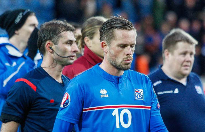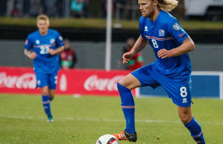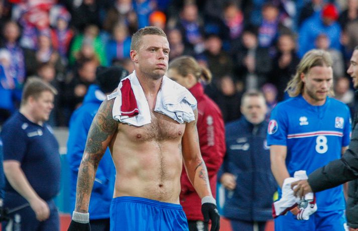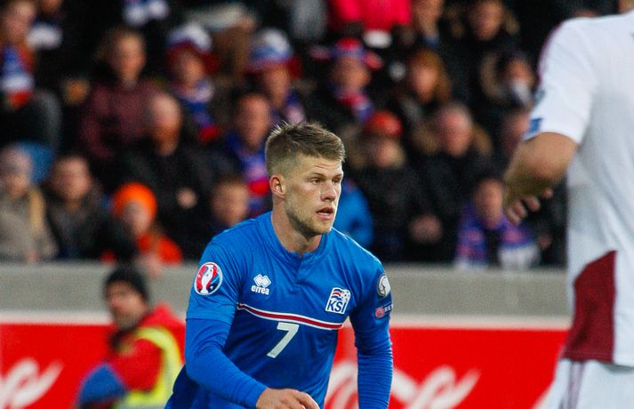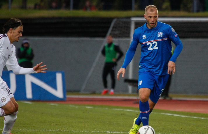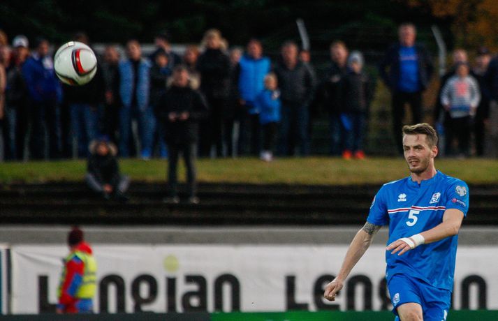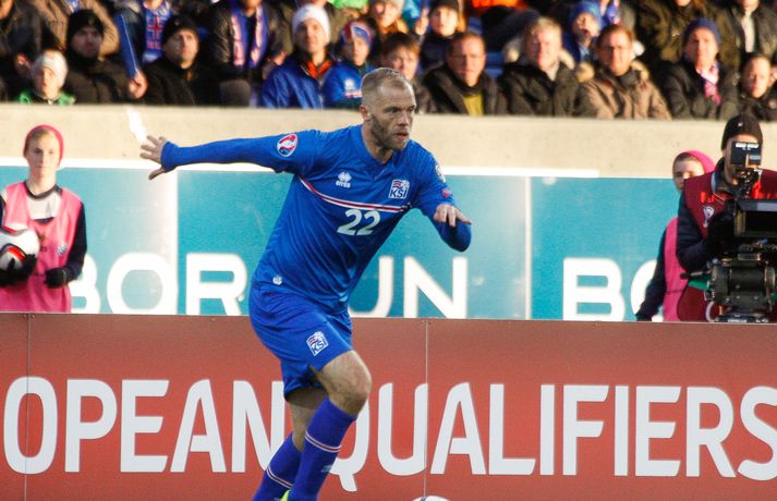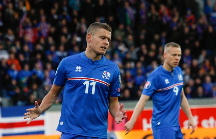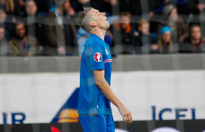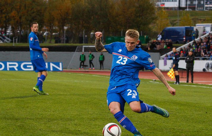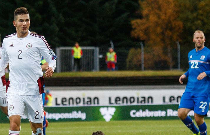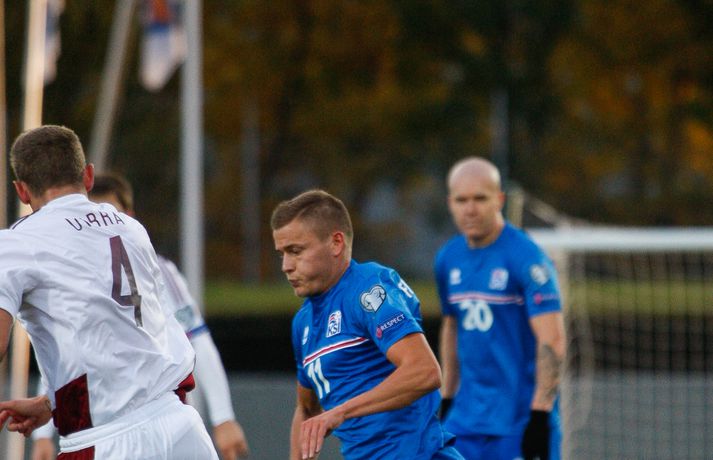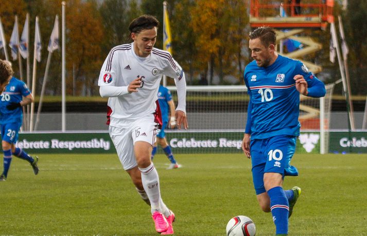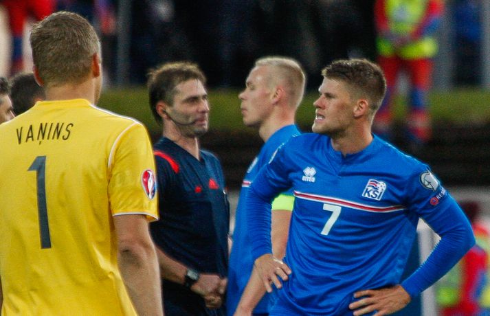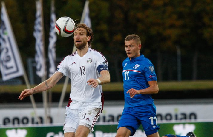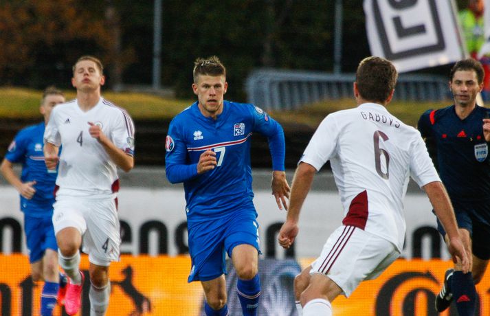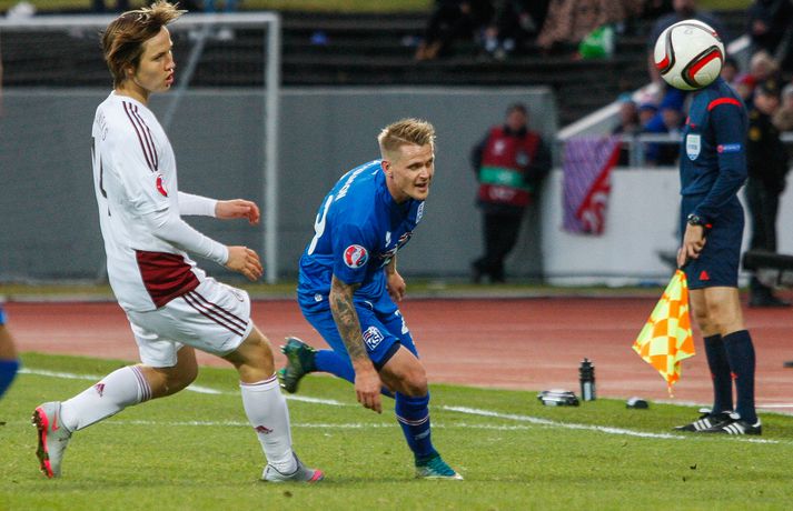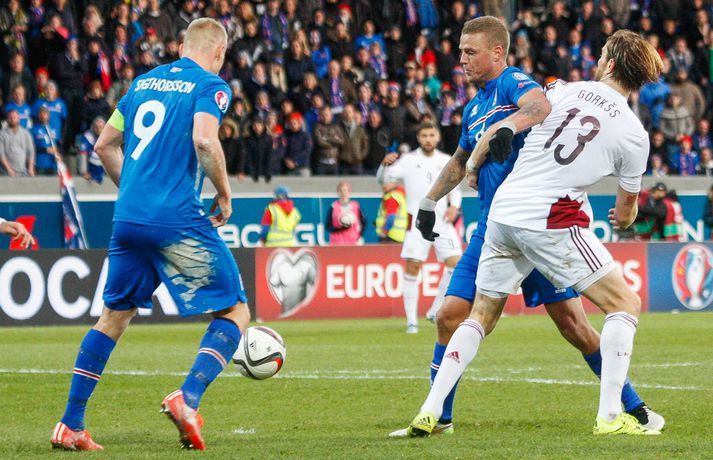 Lettar kipptu liprum íslenskum landsliðsmönnum niður á jörðina í 2-2 jafntefli liðanna í A-riðli undankeppni Evrópumótsins í knattspyrnu í Laugardalnum í dag. Okkar menn léku við hvurn sinn fingur framan af fyrri hálfleik, komust í 2-0 og stefndi í veislu. Lettar svöruðu fyrir sig með tveimur snyrtilegum mörkum í síðari hálfleik og var jafntefli að líkindum sanngjörn niðurstaða. Tvö stig töpuð og Tékkar geta tekið toppsæti riðilsins í kvöld með sigri gegn Tyrkjum.Sjá einnig:Einkunnir okkar manna gegn LettumLjósmyndarar Fréttablaðsins og Vísis, voru á vellinum og smelltu þessum skemmtilegu myndum sem sjá má hér fyrir ofan sem og fyrir neðan. Það var hrein unun að fylgjast með okkar mönnum fyrri hluta fyrri hálfleiks. Yfirburðirnir voru algjörir og tilþrifin og spil manna á milli til algjörrar fyrirmyndar. Kolbeinn skoraði af stuttu færi eftir aðeins fimm mínútur þegar Andris Vanins, markvörður Letta, hafði fengið að kynnast skottækni Gylfa Þórs Sigurðssonar. Átjánda landsliðsmark Kolbeins sem tók annað sætið af Ríharði Jónssyni á lista yfir markahæstu landsliðsmenn okkar frá upphafi. Jóhann Berg fékk svo dauðafæri skömmu síðar en negldi boltanum með sínum veikari fæti beint í markvörð gestanna. Gylfi á sprettinum í aðdraganda annars marksins.Vísir/Vilhelm Annað mark Íslands var af dýrari gerðinni. Eftir pressu Letta barst boltinn á Gylfa. Aðþrengdur klobbaði hann einn andstæðing á eigin vallarhelmingi og geystist af stað. Spretturinn með boltann á tánum varð um 40 metrar áður en Hafnfirðingurinn lét skotið ríða af rétt utan teigs. Augnabliki síðar söng boltinn í netinu og staðan orðin 2-0. Þegar hér var komið við sögu áttu flestir von á markaregni. Lettar höfðu að litlu að keppa og okkar menn í banastuði. Okkar menn héldu áfram að sækja en það gerðu Lettar líka í leik sem opnaðist upp á gátt. Lettar fengu hvert skotfærið utan teigs og maður þakkaði fyrir að Lettar virtust ekki hafa farið á skotæfingu í lengri tíma. Undir lok fyrri hálfleiks fengu þeir svo dauðafæri sem nýttist sem betur fer ekki. Augnabliki síðar var flautað til hálfleiks, staðan góð en margt í ólagi hjá strákunum okkar. Heimir Hallgrímsson sagði í viðtali við RÚV í hálfleik að það þyrfti að skerpa á því að menn yrðu að vera skynsamir, ekki fjölmenna um of í sóknir og bjóða hættunni heim í formi skyndisókna Letta. Skilaboðin sem senda átti til strákanna í hálfleik skiluðu sér ekki.Birkir Bjarnason var eins og margir sprækur framan af leik en átti svo erfitt uppdráttar.Vísir/VilhelmÞegar síðari hálfleikur var hálfnaður blasti ískaldur raunveruleikinn við. Strákarnir höfðu ekki lært af aga- og kæruleysinu sem einkenndi seinni hluta fyrri hálfleiksins og Lettar voru skyndilega búnir að jafna metin í 2-2 með snyrtilega útfærðum mörkum. Inni á milli sýndu okkar menn áfram skemmtilega takta með Gylfa í broddi fylkingar en Vanins í markinu hafði þó lítið að gera. Það sem eftir lifði leiks voru Lettar í raun nær því að stela stigunum þremur. Var eins og orka okkar manna væri hreinlega búin og leikskipulagið glatað. Sendingar hættu að rata á samherja og tvö hörkuskot Letta úr þröngum færum innan teigs hefðu vel getað hafnað í netinu. Varamaðurinn Eiður Smári lagði upp dauðafæri fyrir Kolbein og Birkir Már fékk mjög gott færi í uppbótartíma en allt kom fyrir ekki. 2-2 jafntefli var líklega sanngjörn niðurstaða þegar allt er til tekið.Sölvi Geir og Kolbeinn berjast um skallabolta. Skalli Sölva fór framhjá.Vísir/VilhelmStuðningsmenn Íslands sungu og trölluðu til leiksloka en vonbrigðin þó nokkur enda stefndi í flugeldasýningu í Dalnum. Okkar menn eru vanari því að vera í hlutverki „litla liðsins“, spila þétt og sækja hratt, en í dag voru þeir stóra liðið, líkt og gegn Kasakstan. Aftur tókst ekki að vinna sigur á heimavelli á þjóð sem hefur að engu að keppa sem verður að teljast áhyggjuefni fyrir landsliðsþjálfarana Heimi og Lars. Gylfi Þór var besti maður okkar manna í dag en margir hafa leikið betur. Tenging varnar og miðju stóran hluta leiksins var í molum og Lettar áttu átján skot að marki Íslands. Betri skyttur hefðu skotið okkur í kaf. Liðið saknaði Arons Einars Gunnarssonar fyrirliða sem verður vonandi kominn á sinn stað á miðjuna í lokaleiknum gegn Tyrkjum á þriðjudag. Þá haltraði Kári Árnason af velli í fyrri hálfleik en hann hafði spilað allar mínúturnar í undankeppninni til dagsins í dag. Sölvi Geir Ottesen kom inn á en náði sér ekki á strik frekar en margir þegar kom að varnarleiknum í dag.Vísir/VilhelmEiður Smári: Megum ekki halda að við séum of góðir Eiður Smári Guðjohnsen segir að leikurinn gegn Lettlandi hafi verið ágætisvatnsgusa fyrir Ísland og að það megi læra af honum. Eiður Smári Guðjohnsen segir að það megi ekki gera of mikið úr jafnteflinu gegn Lettlandi í dag þó svo að úrslitin hafi verið vonbrigði. Eftir frábæra byrjun komu Lettarnir til baka og skoruðu tvívegis framhjá Hannesi Þór Halldórssyni, sem var búinn að fá á sig þrjú mörk í síðustu átta mótsleikjum á undan. „Það má eiginlega segja að mér og okkur öllum líði eins og við höfum tapað leiknum miðað við hvernig leikurinn þróaðist,“ sagði Eiður Smári eftir leikinn. „Ég held að þetta sé ágætisvatnsgusa. Við megum ekki halda að við séum orðnir betri en við erum. Það er auðvitað margt sem spilar inn í en seinni hálfleikur var auðvitað engan veginn nógu góður.“ „Ég veit ekki hvort að það hafi verið orkuleysi í okkur eða að við höfum verið aðeins of afslappaðir. Það var greinilegt að við vorum vel á tánum í fyrri hálfleik, unnum all
