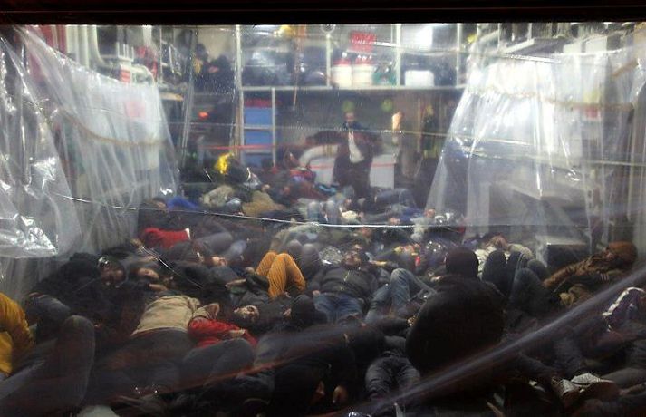 Hafa bjargað um tvö þúsund manns Viktoría Hermannsdóttir skrifar 3. janúar 2015 12:00 Hér má sjá flóttamenn um borð í varðskipinu Tý eftir björgunaraðgerðir í desember. Mynd/Landhelgisgæslan Áhöfn varðskipsins Týs hefur síðan í desember komið að björgun um 2.000 flóttamanna úr fimm stórum flutningaskipum. Í fyrrinótt björguðu skipverjar rúmlega 400 manns úr stjórnlausu skipi sem var á fullri ferð í átt að Ítalíu. Haugasjór og svartamyrkur var á vettvangi þegar skipverjar á Tý reyndu fyrst að komast um borð, að sögn Halldórs Nellett, skipherra á Tý. „Það tókst ekki, við báðum fólkið um að stöðva skipið, þar sem það var engin áhöfn um borð, en það gat það ekki þar sem stjórntækið var ónýtt,“ segir Halldór. Erfiðlega gekk að komast um borð vegna þess hversu vont veður var á svæðinu. Varðskipsmenn kölluðu eftir aðstoð ítölsku strandgæslunnar til þess að reyna að stöðva skipið. Skömmu síðar stöðvaðist það vegna olíuleysis. Stuttu seinna komu sex menn frá ítölsku strandgæslunni einnig um borð með þyrlum. Ekki tókst að koma skipinu aftur í gang og því var það tekið í tog til lands. Fyrst var hlúð að fólkinu um borð sem var orðið aðframkomið. „Það var búið að vera án matar og drykkjar í einhverja daga þannig að við byrjuðum á því að fara með vatnsbirgðir yfir, dreifa þeim og huga að fólkinu,“ segir Halldór. Rúmlega 400 manns voru um borð, þar á meðal um 60 börn og þrjár barnshafandi konur. Ekki var hægt að ferja fólkið yfir í Tý vegna veðursins. Þetta er sjötta árið sem Landhelgisgæslan tekur þátt í verkefnum Frontex – landamærastofnunar Evrópusambandsins. Týr sigldi úr höfn á Íslandi þann 20. nóvember og hóf störf á svæðinu 1. desember. Átján manns eru í áhöfn Týs. Auðunn F. Kristinsson, verkefnastjóri á aðgerðasviði Landhelgisgæslunnar, segir um að ræða nýja tegund af flóttatilraunum á þessu svæði sem fyrst hafi orðið vart við í byrjun desember. „Fram að þessu hafa þetta mest verið fiskibátar, svo núna í lok nóvember, byrjun desember, byrjar þetta flutningaskipaflæði,“ segir Auðunn, en hann hefur einnig tekið þátt í björgunaraðgerðum Týs við Suður-Ítalíu. Á flutningaskipunum eru mun fleiri flóttamenn og segir Auðunn algengt að það séu um 3-400 um borð en það hafi náð allt upp í 1.000 manns í einu skipinu. Fólkið hírist í flutningaskipunum við erfiðar aðstæður, oft án vatns og matar. „Í þessum skipum sem við höfum farið í þá er fólk bara niðri í lest á flatsæng, engin klósettaðstaða og enginn matur,“ segir hann en ferðalagið getur tekið um viku. Að sögn Auðuns er lítið vitað um þessa nýju aðferð en talið að fólk borgi fyrir farið með skipinu. Í þeim tilfellum sem áhöfn Týs hefur komið að eru flestir flóttamennirnir frá Sýrlandi. Hann segir það ekki vitað hvernig áhöfnin fari frá borði en það séu ákveðnar grunsemdir uppi um það. „Það eru einhverjir sem sjá sér hag í þessu. Þeir setja síðan stefnu á Ítalíu og yfirgefa skipin.“ Skipin sjálf séu mjög illa farin og því yfirleitt einskis virði. „Það eru engin verðmæti í þessum skipum í sjálfu sér, þetta virðast vera skip sem er búið að setja í brotajárn eða hætt að nota,“ segir hann. Auðunn segir það erfiða reynslu að koma að þessum björgunaraðgerðum en líka gefandi. „Við reynum að búa vel að fólkinu okkar og undirbúa það vel fyrir þetta. Við erum með ákveðna áætlun í gangi varðandi áfallahjálp og slíkt en þetta gefur fólki líka mikið.“ Flóttamenn Mest lesið Veðurvaktin: Snjókoman rétt að byrja og víða erfið færð Veður Karlmaður lést í Bláa lóninu Innlent Ungur Miðflokksmaður gengst við rasisma og segir af sér Innlent Flugmaðurinn sem fórst millilenti oft í Reykjavík Innlent Snjókoman rétt að byrja Innlent Eldur í blokk við Ljósheima Innlent Bílar út af veginum á Reykjanesbraut Innlent Hvatt til varúðar vegna snjóflóðahættu á suðvesturhorninu Innlent Biðu í fjóra tíma úti á braut og aðra fjóra við farangursbeltin Innlent Ráðgjafinn ráðinn í tímabundið starf eftir dýra skreppitúra Innlent Fleiri fréttir Ráðgjafinn ráðinn tveimur dögum eftir að grennslast var fyrir um málið „Alvöru“ jólasveinn gisti á Hótel Rangá Vesturbæjarlaug opnuð enn eina ferðina eftir viðgerðir Verklagi ábótavant og krefur ríkislögreglustjóra skýringa Mæla með því að farþegar reiði sig ekki á tímaáætlanir Snjókoman mikla, ábótavant verklag ríkislögreglustjóra og jólasveinamót Karlmaður lést í Bláa lóninu Biðu í fjóra tíma úti á braut og aðra fjóra við farangursbeltin Kærðu umdeildar framkvæmdir allt of seint Skellt í lás í sundlaugum borgarinnar vegna veðurs Reglur brotnar og þjónusta sem bjóða ætti út Þarf að borga bætur þrátt fyrir breytingar á hlaupahjólinu Hvatt til varúðar vegna snjóflóðahættu á suðvesturhorninu Meiri kvika en í síðasta gosi Eldur í blokk við Ljósheima Flugmaðurinn sem fórst millilenti oft í Reykjavík Halla leiðir krabbameinsráð ráðherra Snjókomumet og umferðaröngþveiti Segir sameiginlegum gildum Norðurlanda ógnað Fjölmargir farþegar fastir í flugvélum á Keflavíkurflugvelli Ungur Miðflokksmaður gengst við rasisma og segir af sér Sturlað ástand og United vettlingar prjónaðir í bílnum Mesta snjódýpt í Reykjavík sem mælst hefur í október Viðbragðsaðilar í mikilli hættu vegna bíla á sumardekkjum Bílar út af veginum á Reykjanesbraut Vill heimila Samkeppniseftirlitinu að ráðast í húsleitir Snjókoman rétt að byrja Píratar berjist gegn „rísandi bylgju lýðskrums og fasisma“ Skvísur geti virkað sem hálfgerðir þroskaþj