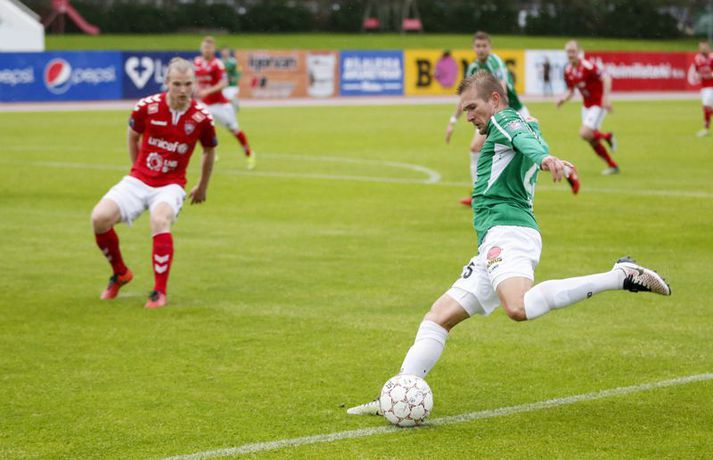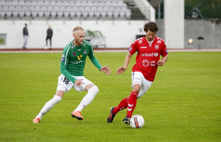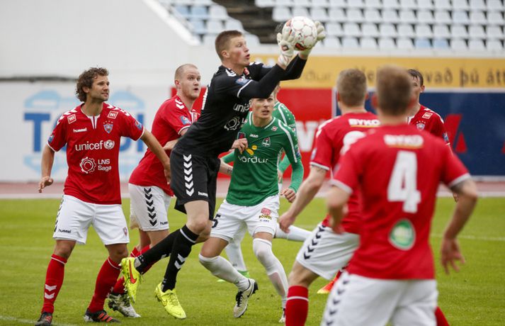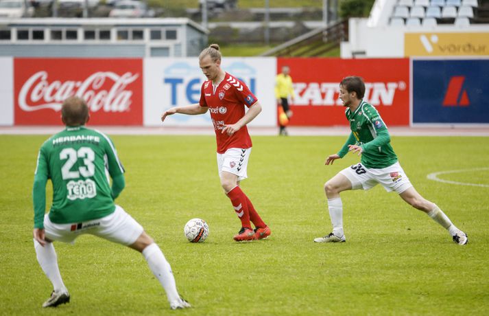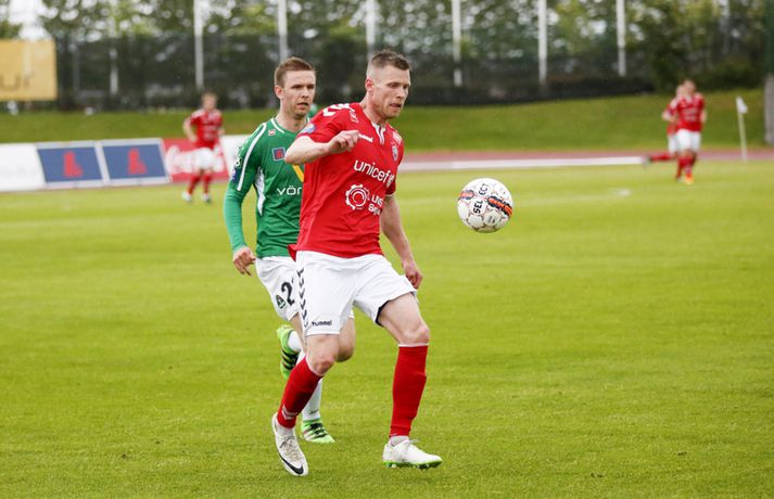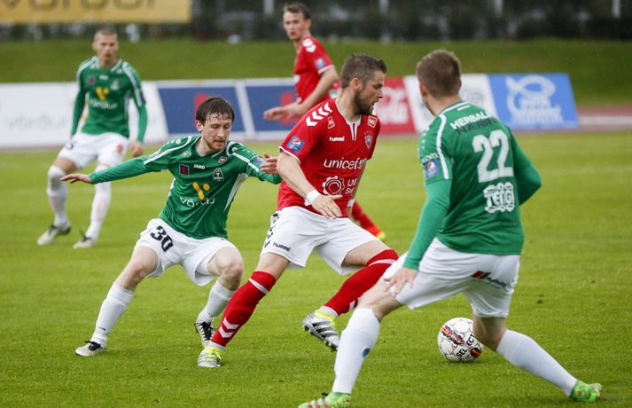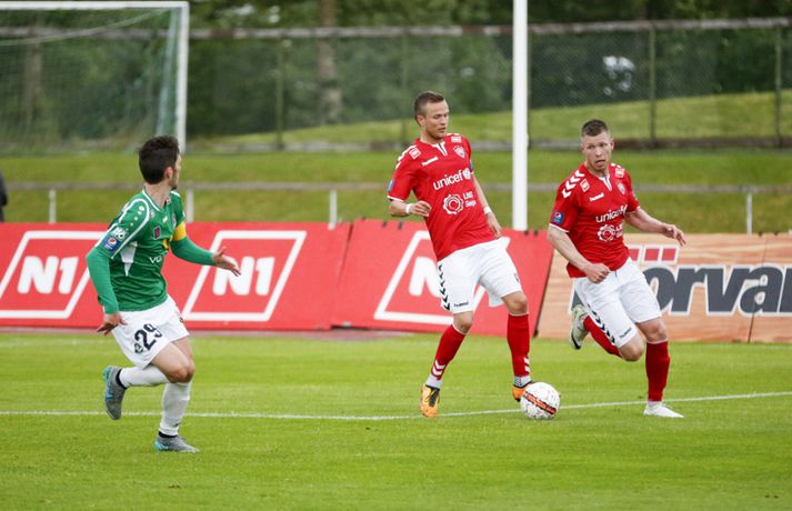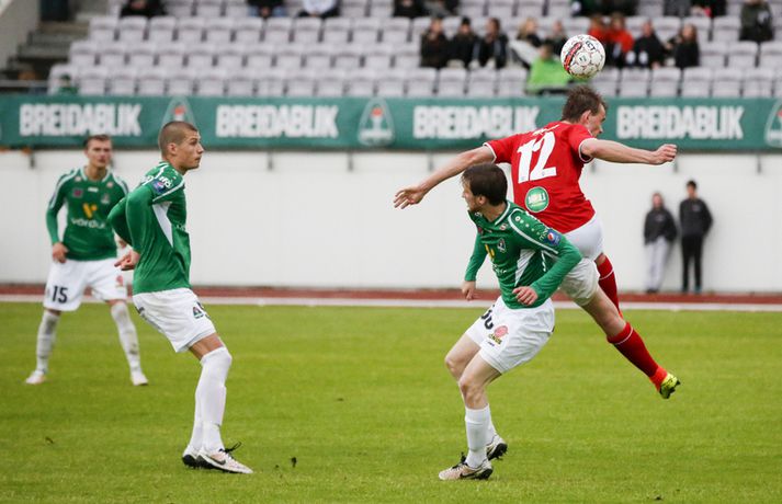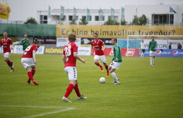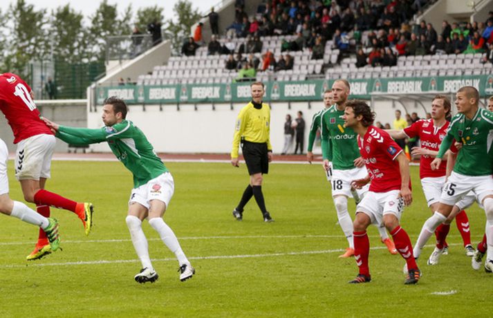 Hvorki leikmönnum Breiðabliks né Vals tókst að skora í kvöld þegar liðin mættust á Kópavogsvelli í 8. umferð Pepsi-deildar karla. Eyþór Árnason, ljósmyndari Vísis og Fréttablaðsins, var á leiknum og náði þessum myndum hér fyrir ofan. Leikurinn var hnífjafn allan tímann og fátt var um færi. Bæði lið fengu þó sína sénsa og hefði annað hvort liðið tekið upp á því að nýta eitt slíkt hefði það skilið á milli. En ef og hefði, hvorugt liðið skoraði og fara þau því með eitt stig á brott.Af hverju skyldu liðin jöfn? Þegar stórt er spurt. Fyrsta klukkutímann var fátt að frétta. Kristinn Ingi Halldórsson fékk algert dauðafæri eftir um tuttugu mínútna leik en annars var leikurinn tíðindalítill. Á síðasta þriðjungi leiksins lifnaði aðeins yfir honum en hvorugu liðinu tókst að nýta þá hálfsénsa sem þau sköpuðu sér. Í viðtali eftir leik sagði þjálfari Vals, Ólafur Jóhannesson, að liðið hefði mætt í leikinn með einn punkt og ætlað sér að halda honum. Það hefur eflaust spilað inn í að liðin voru ekki að stressa sig alltof mikið að sækja og þegar það gerðist virtist vanta einhverja greddu í aðgerðirnar.Þessir stóðu upp úr Það er nokkuð erfitt að velja þá sem voru fremstir meðal jafningja í leiknum. Hafsentar beggja liða fá hrós fyrir að gefa fá færi á sér og fyrir framan varnir liðanna unnu þeir Andri Rafn Yeoman, Breiðabliki, og Sindri Björnsson, Val, mjög vel. Sindri færði sig í djúpa miðjumanninn eftir að fyrirliðinn Haukur Páll fór meiddur út af og stóð sig með prýði. Að öðru leiti verður að hrósa liðunum. Það kom ekki oft fyrir að skipulag liðanna riðlaðist og ef það gerðist var alltaf einhver boðinn og búinn í hjálparvörn. Þó að leikurinn hafi ekki verið mikið fyrir augað þá eru leikmenn eflaust nokkuð sáttir með leikinn. Þó var sjónarmun léttara yfir Hlíðarendapiltum. Að endingu verður að gefa þeim áhorfendum sem mættu á völlinn hrós. Þeir áttu sínar rokur þar sem vel heyrðist í þeim og það er vel.Hvað gekk illa? Markaskorun án alls vafa. Valsmenn fengu betri færi til að setja mark sitt á leikinn en nýttu þau illa. Nikolaj Hansen komst manna næst því að skora þegar hann átti bylmingsfastan skalla sem endaði í stöng en annars fékk maður sjaldan á tilfinninguna að mark væri á leiðinni. Það er eflaust liður í umkvörtunarefninu hér á undan en hvorugt liðið náði að færa sér föst leikatriði í vil. Bæði lið fengu slatta af hornspyrnum (Breiðablik 8 - 10 Valur) og handfylli af aukaspyrnum sem ekkert varð úr. Það er síðan ekki hægt að sleppa því að nefna að skemmtanagildi leiksins var takmarkað löngum stundum. Í það minnsta frá sjónarhóli hins almenna áhorfanda. Leikmenn sjálfir og þjálfarar sjá það eflaust ekki sem löst en það hlýtur að vera ástæða til að minnast á hið hálfgerða andleysi sem einkenndi fyrsta klukkutímann.Hvað gerist næst? Hvorugt liðið hækkaði eða lækkaði í tölfunni við úrslit leiksins. Með jafnteflinu missti Breiðablik hins vegar bæði Fjölni og FH örlítið fram úr sér. Bæði lið unnu sína leiki í kvöld og eru nú þrjú stig upp í Fjölni í öðru sætinu og fjögur í FH. Fyrir neðan eru síðan Stjarnan og Víkingur Ó. bæði með fjórtán stig og leik til góða. Næsti leikur Vals er á móti ÍBV á heimavelli en liðið er með tveimur stigum meira í sjötta sætinu. Það verður að teljast líklegt að Valsmenn bjóði upp á örlítið meiri sóknarbolta í þeim leik og reyni að þoka sér upp töfluna. Á ný er nokkuð langt á milli leikja en næstu leikir liðanna eru í annarri viku júlí. Þá fá Blikar Skagamenn í heimsókn og Valsmenn taka á móti Vestmanneyingum líkt og áður hefur verið komið inn á. Ekkert annað en þrjú stig kemur til greina hjá grænklæddum í þeim leik til að halda í við hin toppliðin.Óli Jó: Ánægður að hafa ekki sömu sýn og þið „Ég er mjög ánægður að ég er ekki með sömu sýn og blaðamenn á þennan leik. Þá væri ég í veseni,“ sagði Ólafur Jóhannesson, þjálfari Vals, í samtali við Vísi eftir jafnteflið markalausa. Að mati landsliðsþjálfarans fyrrverandi voru Blikar líflegri „boltalega séð“ en að strákarnir hans hafi fengið gífurlega fín færi í restina. Það hafi verið svolítið sár að ná ekki að nýta þau. „Við töpuðum báðum leikjunum gegn þeim í fyrra 1-0 svo þetta er einhver framför.“ Hann segir að líkt og allir leikirnir sem hafa farið fram á meðan Evrópumótinu stendur hafi þessi leikur verið hægur. Hann kann þó engar skýringar á hvernig standi á því. „Við fórum inn í þennan leik með eitt stig þegar hann hófst og markmiðið var allan tímann að verja það með kjafti og klóm. Það tókst svo ég er þokkalega sáttur,“ sagði Ólafur.Arnar Grétarsson, þjálfari Blika.Vísir/PjeturArnar Grétars: Kannski ósanngjarn samanburður við EM „Þetta var bara baráttuleikur,“ sagði Arnar Grétarsson þjálfari Breiðabliks. „Það var mikið jafnræði en mér fannst við byrja síðari hálfleikinn vel og vera sterkari framan af honum.“ Það hafi breyst síðasta korterið. Þá hafi Valsararnir unnið sig inn í leikinn og átt meira í honum. „Þeir fengu tvö, þrjú fín færi sem hefðu getað fært þeim sigurinn en heilt yfir, ætli þetta séu ekki sanngjörn úrslit? Ég veit það ekki.“ Líkt og mótþjálfari sinn hafði Arnar engar skýringar á lágdeiðunni í upphafi. „Ég veit ekki hvað það er. Það eru níu dagar frá seinasta leik og það er alls ekki óeðlilega langt. Kannski er þetta bara samanburðurinn við EM.“Guðjón Pétur LýðssonGuðjón Pétur: Hefði þakkað fyrir mig pent „Mér fannst þetta virkilega skemmtilegur leikur. 