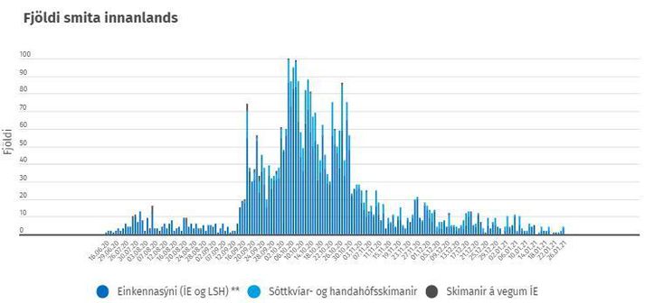 Fjórir greindust innanlands Atli Ísleifsson skrifar 27. janúar 2021 10:57 Bólusetningu er nú lokið hjá 4.789 einstaklingum og er hafin hjá 5.646 til viðbótar. Vísir/Vilhelm Fjórir greindust með kórónuveiruna innanlands í gær. Allir þeir sem greindust voru í sóttkví. Þetta kemur fram í uppfærðum tölum á síðunni covid.is. Alls eru nú sextán á sjúkrahúsi vegna Covid-19. Sex greindust smitaðir á landamærum í gær. Þrír voru með virkt smit í fyrri skimun, tveir reyndust vera með mótefni og er niðurstöðu mótefnamælingar beðið í tilvikum eins. 56 manns eru nú í einangrun, samanborið við 59 í gær. 46 eru nú í sóttkví, en þeir voru 53 í gær. 1.088 eru nú í skimunarsóttkví. Nýgengi innanlandssmita, þ.e. fjöldi smitaðra á hverja 100 þúsund íbúa undanfarnar tvær vikur, er nú 8,7, en var 9,3 í gær. Nýgengi landamærasmita er nú 8,5, en var 12,3 í gær. Alls hafa 6.000 manns greinst með kórónuveiruna hér á landi frá því faraldurinn hófst í lok febrúar. Þá hafa 29 dauðsföll verið rakin til Covid-19 á Íslandi frá upphafi faraldursins. Alls voru tekin 1068 einkennasýni hjá sýkla- og veirufræðideild Landspítalans og Íslenskri erfðagreiningu í gær og 272 sýni á landamærunum eða í seinni landamæraskimun. Bólusetningu er nú lokið hjá 4.789 einstaklingum og er hafin hjá 5.646 til viðbótar. Fréttin hefur verið uppfærð. Faraldur kórónuveiru (COVID-19) Mest lesið Hrindir af stað söfnun fyrir móður stúlkunnar sem lést í Suður-Afríku Innlent Sprengdu rússneskan hershöfðingja í loft upp í Moskvu Erlent Breiddi út faðminn fyrir rasista: „Þið þurfið ekki að biðjast afsökunar á að vera hvít lengur“ Erlent Undirbúningur árásarinnar stóð yfir í marga mánuði Erlent Naut aðstoðar samskiptasérfræðinga vegna veiðigjaldamálsins Innlent „Þetta hefur verið þungur tími“ Innlent Trump skipar sendifulltrúa fyrir Grænland Erlent Málið sem Trump getur ekki losað sig við Erlent Varð vitni að ótrúlegum norðurljósum: „Mér fannst þetta magnað“ Innlent „Ég vil ekki nokkurn tímann sjá neitt svona aftur“ Innlent Fleiri fréttir Vill leiða lista Sjálfstæðismanna í Reykjanesbæ „Þetta hefur verið þungur tími“ Naut aðstoðar samskiptasérfræðinga vegna veiðigjaldamálsins Hrindir af stað söfnun fyrir móður stúlkunnar sem lést í Suður-Afríku Varð vitni að ótrúlegum norðurljósum: „Mér fannst þetta magnað“ Færir nýársboðið fram á þrettándann Fjórir fluttir á sjúkrahús eftir bílveltu á Suðurlandi Leggur aftur til hverfislögreglustöð í Breiðholti Nú má heita Love, Tóní, Ranimosk og Draumur Kvartar til umboðsmanns og vonar að Vegagerðin sjái að sér Ætlar ekki að beita sér í máli starfsmanns Útlendingastofnunar „Ég vil ekki nokkurn tímann sjá neitt svona aftur“ Gyðingar á Íslandi upplifa aukinn ótta Ferðaþjónusta blómstrar í uppsveitum Árnessýslu „Þetta er bara ljótt“ Hljóti að vera komið að því að skoða öryggisgæslu við skóla Ætlar að skýra hvenær rjúfa megi þagnarskyldu Þagnarskylda heilbrigðisstarfsfólks og öryggisgæsla við grunnskóla Eyjólfur í orlof og Inga þrefaldur ráðherra Vegagerðin segir flóðin í Vík fyrirséð Fjölmiðlar, bókmenntir og hægrimennska á Sprengisandi „En hver sagði að þetta ætti að vera auðvelt?“ Milljónir til almannatengla og átta sinnum meira en í fyrra Grunuð um að koma til landsins til að brjóta á öldruðum Leggja hald á skip á alþjóðahafsvæði undan ströndum Venesúela Bindur vonir við Vor til vinstri Systir og amma drengs í meðferð létust í Suður-Afríku „Við erum pottþétt að koma út í mínus, hversu miklum vitum við ekki“ „Þetta er alveg ásættanlegur samningur“ Deildi nöfnum skjólstæðinga á Instagram Sjá meira