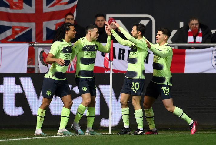 Phil Foden skoarði eina mark fyrri hálfleiksins þegar hann kom gestunum í City yfir strax á sjöundu mínútu og staðan var því 1-0 þegar liðin gengu til búningsherbergja. Foden var svo aftur á ferðinni rúmum stundarfjórðungi fyrir leikslok þegar hann tvöfaldaði forystu gestanna, áður en Kevin De Bruyne gulltryggði 3-0 sigur liðsins, og sæti í átta liða úrslitum um leið. Þá mátti Leicester þola 2-1 tap er liðið tók á móti B-deildarliði Blackburn Rovers. Tyrhys Dolan og Sammie Szmodics sáu um markaskorun Blacburn sitt hvoru megin við hálfleikshléið áður en Kelechi Iheanacho minnkaði muninn fyrir Leicester á 67. mínútu. Blackburn er því á leið í átta liða úrslit FA-bikarsins á kostnað Leicester, en ásamt Blackburn og Manchester City tryggðu Fulham og Brighton sér einnig sæti í átta liða úrslitum. Brighton vann 1-0 sigur gegn B-deildarliði Stoke og Fulham hafði betur í úrvalsdeildarslag gegn Leeds, 2-0. Seinni fjórir leikir 16-liða úrslitanna fara svo fram annað kvöld og að þeim loknum verður dregið í átta liða úrslitin.