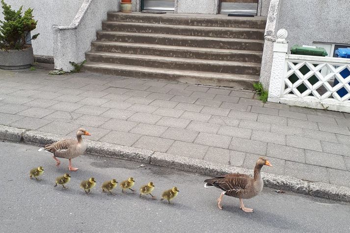 „Ég held þetta sé að nálgast eitthvað á þriðja þúsundið þegar allt er talið,“ segir Arngrímur og vísar til fjölda þeirra sem brugðist hafa við mynd hans inni á Facebook hópi íbúa Hlíðahverfis. Þar birti hann mynd af fjölskyldunni í morgun. Komu spásserandi niður götuna „Ég var bara úti á götu að týna rusl og var litið upp og þá koma þær spásserandi á móti mér,“ segir Arngrímur. „Þær litu hvorki til hægri né vinstri og voru einbeittar og gengu bara yfir götuna. Svo kom bíll að neðan og hann þurfti bara að gjöra svo vel og stoppa á meðan þær fóru sína leið.“ Arngrímur segist ekki hafa séð fjölskylduna áður í götunni. Sjónarspilið hafi því komið vel á óvart. Arngrímur er dýravinur mikill og gladdist við að sjá gæsafjölskylduna í morgun, rétt eins og fleiri íbúar í Hlíðunum. „Þær birtust þarna bara eins og að himnum ofan. Maður var alltaf að sjá gæsir allan ársins hring en ég hef aldrei séð unga hérna áður, enda er ekkert vatn hérna nálægt, ekki einu sinni skurður,“ segir Arngrímur og bætir því við að hann hafi verið fljótur að taka upp símann til að mynda þær. Dvalarstaður við Kringluna „Ég náði frábærri mynd í þriðju tilraun. Núna er fjölskyldan horfin á braut, ég veit ekki hvert hún fór enda passaði ég mig á því að vera ekkert að trufla. Foreldrarnir þurfa frið til þess að koma ungunum á flot.“ Eins og áður segir vakti mynd Arngríms af fjölskyldunni gríðarlega athygli. Svo virðist vera sem fjölskyldan eigi sér samastað í beði við líkamsræktarstöðina World Fit við Kringluna. Það er útvarpsmaðurinn Atli Már Steinarsson sem opinberar þetta en hann tjáir sig við færslu Arngríms og segist hafa fylgst með gæsafjölskyldunni í nokkrar vikur. „Gleður mig mjög mikið þegar ég sá að ungarnir voru búnir að klekjast út og séu vonandi á leið á betri stað til að búa á.“