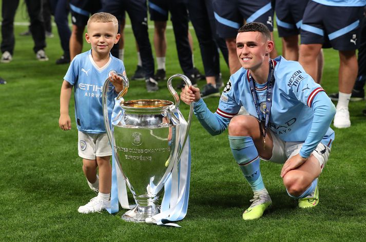 Fjögurra ára sonur Foden strax kominn með tvær milljónir fylgjenda Óskar Ófeigur Jónsson skrifar 27. júní 2023 09:31 Phil Foden og Ronnie sonur hans fagna með bikarinn eftir sigur Manchester City í Meistaradeildinni. Getty/Alex Livesey Ronnie, sonur Phil Foden, sló í gegn þegar hann skemmti sér og leikmönnum Manchester City eftir að liðið vann Meistaradeildina á dögunum. Manchester City liðið skrifaði söguna með því að verða aðeins annað enska félagið til að vinna þrennuna og Ronnie vann hug og hjörtu stuðningsmanna í mörgum myndböndum frá sigurhátíðinni. Ronnie er bara fjögurra ára gamall en hann setti engu að síður upp sína eigin Instagram síðu með góðri hjálp foreldra sinna. Það vantaði ekki viðbrögðin því Ronnie fékk milljón fylgjendur á aðeins fjórtán tímum. Fyrsta færslan var geggjuð mynd af honum á öxlum föður síns að gefa stuðningsmönnum Manchester City fimmu á leið sinni inn til búningsklefa. Stuðningsmenn City hafa kallað strákinn „El Wey” og hann átti mörg skemmtileg móment í titilfögnuði liðsins. Pabbinn Foden er aðeins 23 ára gamall en er engu að síður búinn að vinna ensku deildina fimm sinnum, enska bikarinn tvisvar, enska deildabikarinn fjórum sinnum og nú Meistaradeildina einu sinni. Þetta gera alls ellefu stórir titlar og við bætast síðan tveir Samfélagsskildir. Hér fyrir neðan má sjá fyrstu færslu Ronnie Foden en Instagram síðan hans er nú komin með yfir tvær milljónir fylgjenda. View this post on Instagram A post shared by Ronnie Foden (@officialronniefoden_) Enski boltinn Mest lesið Þessi tíu eru tilnefnd sem Íþróttamaður ársins 2025: 23 ára aldursmunur Sport Sakaður um niðurlægingu: „Við viljum ekki hafa hann sem þjálfara“ Handbolti Erfitt að vera í burtu þegar mamma greindist Fótbolti Einn leikmaður með samning og völlurinn ólöglegur Fótbolti Áfallið staðreynd og Isak búinn í aðgerð Enski boltinn Vildi tapa legg: „Mesti hávaði sem ég hef heyrt“ Sport Missti alveg stjórn á skapinu en það skilaði sigri Körfubolti Salah færði Egyptum draumabyrjun Fótbolti Slot mun sakna Isak í tvo mánuði eftir „glórulausa tæklingu“ Enski boltinn Kansas frá Kansas til Kansas Sport Fleiri fréttir Jiménez jafnaði bestu vítaskyttu sögunnar Slot mun sakna Isak í tvo mánuði eftir „glórulausa tæklingu“ Sjáðu „auma“ vítið sem skilaði Fulham sigri Fulham skildi Forest eftir við fallsvæðið Áfallið staðreynd og Isak búinn í aðgerð Fagnaði titli Liverpool sem óður maður um alla borg „Allir virðast elska hann“ „Þetta mun ekki buga okkur“ Guardiola mun vigta leikmenn Man City eftir jólin „Ef þið væruð Antoine Semenyo, hvert mynduð þið fara?“ Sjáðu mörkin: Rogers sá um Manchester United Óttast að Isak hafi fótbrotnað Tvenna frá Rogers tryggði Villa sigur gegn Manchester United Fimmta sinn sem Arsenal er á toppnum um jólin: Unnu ekki titilinn í fyrstu fjögur skiptin „Viljum við að okkar verði minnst fyrir að vera skræfur?“ „Ef dómarinn hefði sinnt sínu starfi almennilega hefði Romero ekki fengið spjald“ Haaland gaf barnabarni Hareide gjöf Sjáðu mörkin úr enska: Sviptingar, sænskt þema og svakalegar tæklingar Calvert-Lewin hættir ekki að skora Gyökeres skaut Arsenal aftur á toppinn Slot fámáll um stöðuna á Isak Gleði og sorg í sigri Liverpool Dramatík er Broja reyndist hetja Burnley Haaland frábær er Manchester City komst á toppinn Andri Lucas skoraði í langþráðum sigri Blackburn Chelsea vann upp tveggja marka forskot á St James' Park Ekkert fararsnið á Guardiola sem segir að City verði að vera undirbúið Tíu bestu mörkin úr leikjum Liverpool og Tottenham Salah bað samherjana afsökunar Lineker fokillur við blaðamann: „Þvílíkt kjaftæði“ Sjá meira