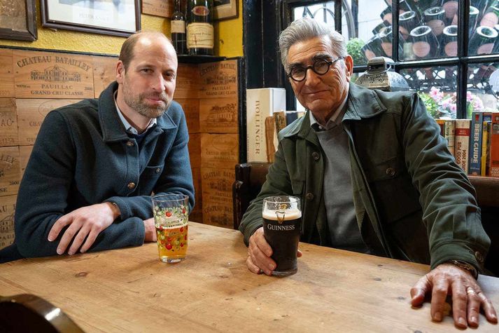 Breska ríkisútvarpið fjallar um viðtalið og hefur eftir innanbúðarfólki sínu innan úr höllinni að prinsinn hafi aldrei verið eins opinskár með framtíðarfyrirætlanir sínar. Vilhjálmur verður konungur þegar faðir hans, Karl konungur hinn þriðji, fellur frá. Karl er orðinn 76 ára gamall. Eugene Levy spurði prinsinn hvernig hann sæi fyrir sér tíð sína sem konungur. „Ég held að það sé óhætt að segja það að breytingar séu á dagskránni,“ svaraði prinsinn. „Breytingar til hins betra, og ég fagna þeim, ég nýt þess. Ég óttast þær ekki, það er sá hluti sem ég er spenntur fyrir, hugmyndinni um að geta komið á einhverjum breytingum. Ekki of róttækum, en breytingum sem ég tel að þurfi að verða.“ Þá sýndi prinsinn kanadíska leikaranum Windsor-kastala. Þeir ræddu margt og mikið, prinsinn sagði leikaranum að hann væri aðdáandi American Pie kvikmyndabálksins þar sem Levy fór með stórt hlutverk. Þá ræddi hann sögu fjölskyldu sinnar. „Ég held að ef þú passar þig ekki þá geti sagan reynst þér fjötur um fót og líkt og akkeri sem heldur aftur af manni og manni getur fundist það yfirþyrmandi, og fundist hún takmarka sig um of. Og ég held það sé mikilvægt að lifa í núinu, hér og nú.“ Þess er getið í umfjöllun breska ríkisútvarpsins að prinsinn hafi tekið fram að hefðir séu mikilvægar. Hann segist hins vegar óhræddur við að spyrja spurninga. „Það koma tímar þar sem maður lítur á hefðir og spyr sig: Henta þær enn tilgangi sínum í dag? Er þetta enn það rétta í stöðunni? Erum við enn að gera það sem við gerum og hafa eins mikil áhrif og við gætum haft?“ spyr prinsinn. „Þannig að ég vil gjarnan efast um hlutina, það er það sem ég er í raun að reyna að segja.“ Leikarinn segist hafa verið hissa á því hvað prinsinn opnaði sig mikið. Ian Gavan/Apple TV+ Ræddi veikindin í fjölskyldunni Þá eru leikarinn og prinsinn á persónulegu nótunum þar sem þeir rölta um ganga kastalans. Talið berst að fjölskyldunni, hvernig það hefur tekið á Vilhjálm að bæði faðir hans og eiginkona séu með krabbamein. „Það sem tengist fjölskyldunni getur verið yfirþyrmandi, alveg töluvert. Þú veist, áhyggjur eða streita í kringum fjölskyldumálin – það er alveg yfirþyrmandi fyrir mig.“ Þeir koma sér næst í þættinum fyrir á knæpu skammt frá Windsor kastala, Two Brewers pub. Þar lýsir prinsinn því hvernig það var fyrir krakkana hans að takast á við veikindi móður sinnar. „Við reynum að tryggja að við veitum þeim það öryggi og þá vernd sem þau þurfa,“ sagði hann við Levy. „Og við erum mjög opin fjölskylda, þannig að við tölum um það sem veldur okkur áhyggjum og það sem angrar okkur, en maður veit aldrei alveg hvaða afleiddu áhrif það getur haft. Og þess vegna er bara mikilvægt að vera til staðar fyrir hvort annað og hughreysta börnin og fullvissa þau um að allt sé í lagi.“ Prinsinn fór í síder, Eugene Levy í Guinness bjór.Ian Gavan/Apple TV+ Ekki fara í sömu aðstæður og með Harry Vilhjálmur ræðir lítið sem ekkert í viðtalinu um samband sitt við bróður sinn Harry. Harry eins og lesendur muna eflaust eftir fluttur til Bandaríkjanna og hefur reglulega lýst því yfir að eiga í erfiðu sambandi við bróður sinn. Prinsinn minnist þó á bróður sinn við Levy þegar hann er spurður út í það hvernig það var að alast upp í konungsfjölskyldunni. „Ég vona að við förum ekki aftur í sumt af því sem var í gamla daga, það sem ég og Harry ólumst upp við. Og ég mun gera allt sem ég get til að tryggja að við hverfum ekki aftur til þess ástands.“ Þá ræðir BBC við kanadíska leikarann vegna viðtalsins og segist Levy hafa verið hissa á því hvernig prinsinn hafi verið eins og opin bók. Hann segist hafa litið á þetta sem samræður en ekki endilega að þarna væru ný tíðindi, skúbb, á ferðinni. „Hann sagði mér hvað honum gekk til og við gátum spjallað saman. Þetta var algjörlega súrrealískur dagur fyrir mig.“ Undir lok viðtalsins þegar prinsinn og leikarinn klára drykkina á knæpunni segist Vilhjálmur vilja skapa heim sem sonur hans geti verið stoltur af. „Þú veist, lífið er líka til þess að reyna á okkur og það getur svo sannarlega verið krefjandi á köflum, og að geta sigrast á því er það sem gerir okkur að því sem við erum,“ segir prinsinn. „Ég er svo stoltur af konunni minni og föður mínum fyrir hvernig þau hafa tekist á við allt síðasta ár. Börnunum mínum hefur líka gengið frábærlega.“