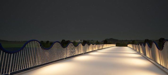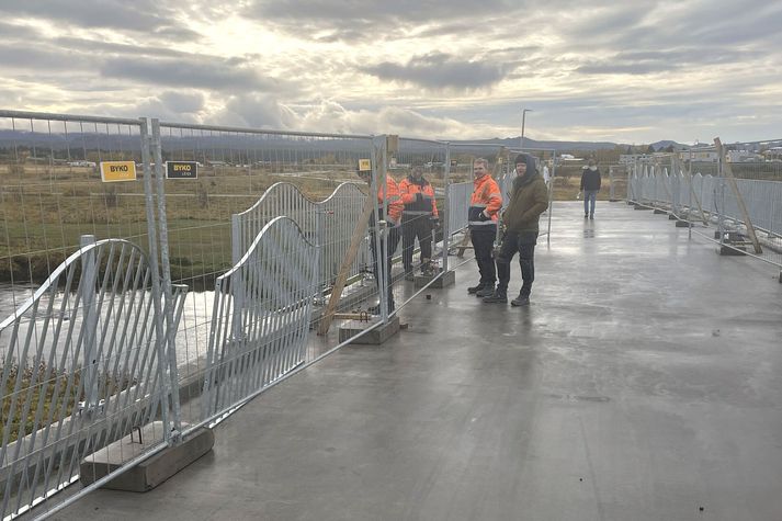 Malbikunarflokkur frá Loftorku lauk í gær malbikun vegna efri brúarinnar, þeirrar sem nær er Breiðholtsbraut. Brúargólfið og aðliggjandi stígar voru malbikaðir og opnaðist brúin síðdegis fyrir gangandi og hjólandi vegfarendur. Malbikunarflokkur Loftorku lauk malbikun brúargólfs og aðliggjandi stíga í gær.kmu Brúarsmíðin er einn verkþátta Arnarnesvegar, milli Rjúpnavegar og Breiðholtsbrautar, sem Suðurverk og Loftorka annast fyrir Vegagerðina. Verkið er unnið í samstarfi við Kópavogsbæ og Reykjavíkurborg. Enn er þó aðeins bráðabirgðahandrið á brúnni. Starfsmenn á vettvangi sögðu stefnt að því að setja varanlegt handrið í næstu viku. Þá er frágangur kanta og uppsetning lýsingar eftir. Brúarsmíðin er einn verkþátta Arnarnesvegar um Vatnsendahæð.kmu Vegagerðin segir tekið mið af viðkvæmri staðsetningu yfir Elliðaárnar og sérstaklega hugað að því að brúin falli vel inn í landslagið. Hún verði mikil samgöngubót fyrir gangandi og hjólandi vegfarendur. Hún leysir af eldri göngubrú skammt frá sem þykir ekki standast nútímakröfur og jafnvel varasöm. Í lýsingu Vegagerðarinnar segir að sitt hvoru megin við gömlu brúna þurfi að ganga upp þröngar og nokkuð brattar tröppur sem reynst hafi mörgum farartálmi. Yfir vetrartímann hafi fólk átt í erfiðleikum með að fara um brúna, ekki síst með vagna, kerrur eða hjól. Á neðri brúnni voru starfsmenn Járnsmiðju Óðins að setja upp varanlegt handrið í gær.kmu Fimmhundruð metrum neðar í dalnum voru starfsmenn Járnsmiðju Óðins í gær að setja upp varanlegt handrið á hina brúna, sem risin er í Grænugróf neðan Fella- og Hólakirkju. Sú brú opnaðist umferð í byrjun nóvember í fyrra, fyrir ellefu mánuðum. Í næstu viku er svo áformað að setja lýsingu á brúna. Reykjavíkurborg stendur að brúargerðinni í Grænugróf. Hún er hluti verkefna samgöngusáttmálans milli ríkisins og sveitarfélaganna sex á höfuðborgarsvæðinu. Verktakafyrirtækið Gleipnir annast smíði brúarinnar. Svona mun neðri brúin líta út í myrkri. Mikið er lagt í lýsingarhönnun og mun brúin setja svip á umhverfið. Lýsingin mun beinast niður á brúargólfið.Reykjavíkurborg/Liska