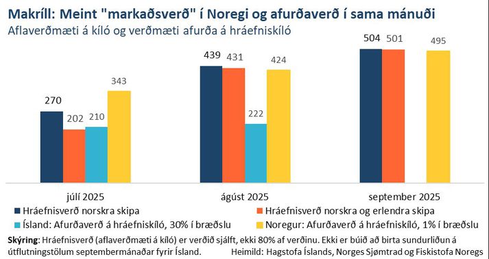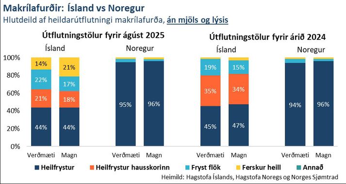 Þrátt fyrir að sjávarútvegur hafi verið grunnatvinnuvegur þjóðarinnar um langt skeið er gangverkið þar ekki með öllum auðskilið. Það á sér eðlilegar skýringar og þeirra má leita í breyttri þjóðfélagsgerð; fólk hefur einfaldlega minni tengingu við atvinnugreinina en áður. Bagalegra er þó að svo virðist sem ráðamenn sem setja lög og reglur átti sig ekki að fullu á hvernig íslenskur sjávarútvegur virkar. Þessari grein er ætlað að varpa ljósi á afleiðingarnar þegar staðreyndum er ýtt til hliðar en skynjun og hugmyndafræði sett í öndvegi. Hér verður sérstaklega vikið að nýrri aðferð við að verðleggja makríl, en breyting var gerð á henni með lögum um hækkun á veiðigjaldi sem tók gildi í sumar. Fiskur er ekki bara fiskur Eitt af því sem stjórnvöld lögðu til grundvallar breytingunni var að fiskur væri bara fiskur og á honum væri heimsmarkaðsverð. Þetta er rangt. Hér verður að horfa til gæða, nýtingar, vinnsluhátta og á hvaða markaði makríll er seldur. Atvinnuvegaráðherra hélt því fram í hlaðvarpi fyrr á árinu að: „Þegar upp er staðið þá er verið að selja sama fisk, af norskum og íslenskum aðilum, til sömu aðila. Það er heimsmarkaðsverð á þessu og það er það sem við erum að miða við.“ Þó að reynt hafi verið að leiðrétta þessa augljósu rangfærslu ráðherrans, þá liggur hún nú til grundvallar nýjum útreikningi á verðmæti makríls. Enn er því auðsýnt að forsendur nýrra laga um veiðigjald af makríl standast ekki. Þetta skiptir máli og það sem hér fer á eftir sýnir það berlega. Er verið að veiða við sömu aðstæður? Fiskur er lifandi hráefni. Því skiptir máli fyrir gæði hans, hvenær árs hann er veiddur, hvar hann er veiddur, hvernig hann er veiddur og hversu langt þarf að sigla með hann til löndunar. Norðmenn veiða makríl við bestu mögulegu aðstæður í norskri og breskri lögsögu, þeir veiða nær eingöngu með hringnót sem fer betur með fiskinn, veiðiferðir eru stuttar því makríllinn er skammt undan landi og hráefnið er ferskt sem fer nánast að öllu leyti beint í vinnslu. Þessu er ekki að heilsa hjá íslenska flotanum. Á sama tíma veiðir hann makríl í flotvörpu langt frá landi og aflinn er því geymdur í tönkum skips í töluverðan tíma áður en hann kemst í vinnslu. Stjórnvöld kjósa að líta fram hjá þessum lykilþáttum sem þó ráða úrslitum um gæði hráefnis og þar með hversu mikið fæst fyrir það. Er verið að selja sama fisk? Spurningin felur í sér hvort verið sé að selja sama hráefnið, því makríll er makríll. Rétt er því að gaumgæfa nokkrar tölulegar staðreyndir. Á myndinni hér að neðan má sjá samsetningu makrílafurða í útflutningi Íslands og Noregs, fyrir ágúst á þessu ári og fyrir allt árið 2024. Makrílmjöl og lýsi eru undanskilin í tölunum. Það blasir við að samsetningin er gjörólík. Útflutningur Norðmanna er nær alfarið heilfrystur makríll, sem vegur um 96% af útflutningi þeirra. Hlutur heilfrysts makríls frá Íslandi er rúmlega helmingi minni, eða 44–47%. Heilfrystur hausskorinn makríll finnst hvergi í tölum Norðmanna og fryst flök eru mun fyrirferðameiri í íslenskum vinnslum. Munurinn endurspeglar fyrst og fremst gæði hráefnisins, sem eru mun betri hjá Norðmönnum og gerir þeim kleift að vinna nánast allan aflann í heilfrystingu en sú vinnsluaðferð skilar hæsta verði fyrir hvert kíló hráefnis. Þetta sýnir svo ekki verður um villst að þótt makríll sé vissulega makríll þá eru gæði hans afar mismunandi og verðið á honum fer eftir gæðum en ekki því hvað fiskurinn heitir. Afurðaverð er ekki hráefnisverð – nýting skiptir máli Ólíkir afurðaflokkar fela í sér mismunandi nýtingu á hráefni en það ræður því hversu mikil verðmæti fást fyrir hvert kíló sem dregið er úr sjó. Sú vinnsluaðferð sem skilar hæstu verði er heilfrysting, þar sem allt fer til manneldis. Þegar hausinn er skorinn frá lækkar nýtingin í um 67% og við flakavinnslu í um 40%. Afgangurinn er afskurður sem fer í mjöl og lýsi þar sem nýting er mun lægri, aðeins 37,5% af upphaflegu magni stendur eftir sem fullunnin afurð. Í sumum tilvikum eru gæði aflans þannig að honum er landað að hluta til beint í bræðslu, en það hlutfall hefur verið um 30% hjá Íslendingum undanfarin ár en aðeins um 1% hjá Norðmönnum. Þessir þættir ráða því hvaða verð fæst fyrir aflann en í forsendum verulega hækkaðs veiðigjalds er hvorki litið til vinnsluhátta né nýtingarhlutfalls. Er verið að selja til sömu aðila? Lítum nú á hvort fullyrðing ráðherra um að Íslendingar og Norðmenn selji til sömu aðila standist. Myndin hér að neðan sýnir hvernig útflutningur á makrílafurðum (mjöl og lýsi undanskilið) skiptist eftir heimsálfum í ágúst og á öllu árinu 2024. Þar sést að Íslendingar flytja mest út til Evrópu, einkum til Austur-Evrópulanda. Útflutningur Norðmanna er fyrst og fremst til Asíu þar sem hæsta verðið fæst. Munur á markaðsaðgangi er afgerandi. Asíulönd eins og Japan, Suður-Kórea og Kína greiða hæsta verðið fyrir heilfrystan makríl og gera strangar kröfur um stærð, fituinnihald og meðhöndlun. Norðmenn hafa áratuga reynslu af makrílveiðum og -vinnslu og öflug markaðssetning þeirra hefur gert „norskan makríl“ að þekktu vörumerki í Asíu. Íslenskur makríll er sjaldnast af sömu gæðum. Veiðitímabil, veiðisvæði, veiðiaðferðir og langar siglingar frá miðum til vinnslu gera hann óhentugan fyrir hágæðamarkaði í Asíu. Þess í stað ratar hann á verðnæmari markaði í Austur-Evrópu. Þar er hann niðursoðinn, reyktur eða fer til annarrar vinnslu þar sem kröfur eru minni og verðið mun lægra. Þótt íslenskur makr