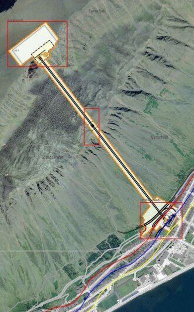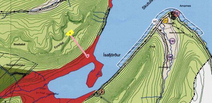 Þessi teikning af kláfnum birtist í frétt Stöðvar 2 árið 2007.skjáskot/Stöð2 „Tilgangur framkvæmdarinnar er að skapa einstaka upplifun fyrir ferðamenn sem heimsækja Ísland sem og heimabyggðina sjálfa. Framkvæmdin miðar að því að bjóða upp á aðstöðu til skemmtunar og útsýnis yfir Ísafjörð og nágrenni, ásamt því að þróa svæðið sem útivistar- og afþreyingarsvæði,“ segir í greinargerð Eflu fyrir Eyrarkláf. Tillaga að breyttu skipulagi vegna Eyrarkláfs.Efla/Eyrarkláfur ehf. Þar segir ennfremur um staðarvalið: „Eyrarfjall liggur nálægt byggðinni og býður upp á einstakt útsýni yfir Ísafjörð og nágrenni. Fjallshlíðin er brött og hentar vel til að tryggja einstaka upplifun. Byrjunarstöðin er í göngufæri frá miðbæ bæjarins sem tryggir gott aðgengi og lágmarkar umferð.“ Fram kemur að aðrir útsýnisstaðir sem skoðaðir voru þyki minna ákjósanlegir vegna lakara útsýnis, minni nálægðar við miðbæinn og aukinnar hættu á snjóflóðum. Á svæðinu er gert ráð fyrir lyftuhúsum fyrir kláfinn, millimastri og endastöð. Á toppi Eyrarfjalls er einnig gert ráð fyrir byggingu þjónustuhúss sem muni hýsa veitingastað. Í síðasta áfanga uppbyggingarinnar er gert ráð fyrir hóteli. Kláfurinn mun hafa áhrif á aðflug og brottflug frá Ísafjarðarflugvelli og þarf því að hindranalýsa kláfinn samkvæmt alþjóðlegum kröfum í samráði við Isavia og Samgöngustofu. Eyrarfjall er við norðanverðan Skutulsfjörð. Kláfurinn kæmi beint upp af Eyrinni.Efla/Eyrarkláfur Hugmyndin hefur verið lengi í bígerð en fjallað var um kláfinn í fréttum Stöðvar 2 árið 2007, fyrir átján árum. Í fréttinni má sjá útsýnið af Eyrarfjalli: