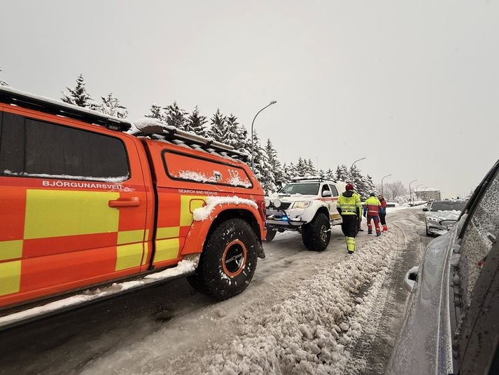 „Þetta er þungt ástand. Gatnakerfið er erfitt og mikill klaki enn þá á götum. Fólk fer hægt sem betur fer, en það er erfitt ástand. Hann segir ekki umferðarteppur heldur gangi hún hægt. Hann telur marga hafa farið fyrr af stað en áður og því hafi umferðin fyrr orðið nokkuð þung. Fólk hafi verið hvatt til að gefa sér tíma og því hafi það farið fyrr út. „Ég held að það sé fyrst og fremst að gefa sér tíma, sem veitir ekki af,“ segir Árni sem fór yfir stöðuna í dag og í gær í Bítinu á Bylgjunni í morgun. Vetrarfríi margra grunnskóla á höfuðborgarsvæðinu lýkur í dag þó að einhverjir séu með starfsdaga. Árni segir mögulega að það hafi áhrif en fyrst og fremst hafi fólk upplifað í gær að vera fast í umferð í marga klukkutíma og því hafi það lagt fyrr af stað í dag. „Sem er gott, það þarf að dreifa álaginu á meðan gatnakerfið er eins og það er.“ Árni segir ástandið í gær ekki fordæmalaust í Reykjavík en hann hafi þó aldrei upplifað svona ástand í október. Hann hafi frekar upplifað það í febrúar eða mars. Umferðarteppur mynduðust víða í gær og voru margir í margar klukkustundir á leið til eða frá vinnu. Vísir/Anton Brink Ekki séð ástandið svona í október „Þetta er dálítið snemmt,“ segir hann og að fyrst og fremst hafi vandamálið sem skapaðist verið vegna illa búinna bíla. „Stór hluti ökuflotans á höfuðborgarsvæðinu er enn á sumardekkjum. Dálítið leiðinlegt að upplifa það að þrátt fyrir ítrekuð fyrirmæli frá lögreglunni þá voru margir sem fóru af stað og lentu í vandræðum og stoppuðu þar sem allan snjómokstur og hálkuvarnir á gatnakerfinu,“ segir Árni og að það hafi skapast við þetta mikið leiðindaástand. „Það má segja að höfuðborgarsvæðið hafi bara verið stopp á stórum hluta gærdagsins og fyrst og fremst var þetta vegna þess að bílar fóru af stað þrátt fyrir okkar tilmæli á sumardekkjum.“ Árni segir erfiðar aðstæður sérstaklega skapast þegar snjómoksturstæki og hálkuvarnatæki fá ekki að komast að. Þá skapist klaki á götunum og við það geti ökumenn hvernig bíla sem er lent í vandræðum. Sama hvort það séu strætisvagnar, vinnubílar og alveg sama hvort bílarnir væru á góðum vetrardekkjum eða negldum dekkjum. Árni segir töluverðan fjölda bíla hafa verið dregna í gær, hann sé ekki með nákvæma tölu en það hafi eflaust verið nokkuð tugir. Það sé alltaf á kostnað eigenda. „Ef bíll var skilinn eftir vegna þess að hann var á sumardekkjum og veldur umferðarhættu þá látum við bara fjarlægja þennan bíl.“ Árni segir ökumenn, þrátt fyrir ástandið, hafa verið nokkuð létta. Dagurinn verði í minningunni „dagurinn sem allt stoppaði“ en lögreglumenn hafi á sama tíma verið svekktir vegna þess að ökumenn hundsuðu fyrirmæli þeirra sem voru send á nokkurra mínútna fresti í gærmorgun á samfélagsmiðla lögreglu og á fjölmiðla. „Okkar tilfinning er að afar fáir hafi farið eftir þessu, það fóru margir út í umferðina á illa búnum bílum sem orsakaði þetta leiðindastand.“ Þá segir hann lögreglu hafa hvatt fólk í hádeginu til að fara snemma heim, um klukkan 15, og það hafi allir svo farið eftir henni. Björgunarsveitir voru í viðbraðgsstöðu um allt höfuðborgarsvæði í gær. Vísir/Sigurjón Þurfi að skoða hvað gerðist í gær Árni segir alveg möguleika að skoða hvort þörf sé á að skoða þær leiðir sem lögregla hefur til að ná til almennings með svona skilaboð. Hvort til dæmis hægt væri að senda SMS eins og er gert í almannavarnahættu eins og jarðhræringum og eldgosum. Árni segir lögreglu og aðra viðbragðsaðila nú þurfa að skoða þetta. Sem betur fer hafi ekki komið upp nein stór mál í gær og svona ástand geti haft veruleg áhrif á viðbragðstíma viðbragðsaðila. Árni telur þó að meirihluti íbúa fylgist með einhverjum miðlum og því megi alveg gera ráð fyrir því að þau hafi getað séð þessar tilkynningar á einhverjum þeirra mörgu miðla sem þær voru sendar út á.