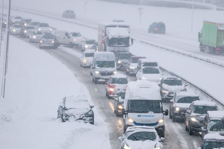 Lögreglumenn svekktir að sjá hversu margir hundsuðu fyrirmæli í gær Lovísa Arnardóttir skrifar 29. október 2025 08:41 Árni segir sem betur fer ekkert alvarlegt hafa komið upp í gær en það sé nauðsynlegt að skoða hvernig hægt sé að koma í veg fyrir að slíkt ástand skapist aftur. Vísir/Sigurjón og Ívar Fannar Árni Friðleifsson, aðalvarðstjóri umferðardeildar Lögreglunnar á höfuðborgarsvæðinu, segir stöðuna enn erfiða í umferðinni. Sjálfur fór hann út klukkan sjö í morgun. Hann segir lögreglu svekkta í gær að sjá hversu margir fóru út á vanbúnum bílum í gær. „Þetta er þungt ástand. Gatnakerfið er erfitt og mikill klaki enn þá á götum. Fólk fer hægt sem betur fer, en það er erfitt ástand. Hann segir ekki umferðarteppur heldur gangi hún hægt. Hann telur marga hafa farið fyrr af stað en áður og því hafi umferðin fyrr orðið nokkuð þung. Fólk hafi verið hvatt til að gefa sér tíma og því hafi það farið fyrr út. „Ég held að það sé fyrst og fremst að gefa sér tíma, sem veitir ekki af,“ segir Árni sem fór yfir stöðuna í dag og í gær í Bítinu á Bylgjunni í morgun. Vetrarfríi margra grunnskóla á höfuðborgarsvæðinu lýkur í dag þó að einhverjir séu með starfsdaga. Árni segir mögulega að það hafi áhrif en fyrst og fremst hafi fólk upplifað í gær að vera fast í umferð í marga klukkutíma og því hafi það lagt fyrr af stað í dag. „Sem er gott, það þarf að dreifa álaginu á meðan gatnakerfið er eins og það er.“ Árni segir ástandið í gær ekki fordæmalaust í Reykjavík en hann hafi þó aldrei upplifað svona ástand í október. Hann hafi frekar upplifað það í febrúar eða mars. Umferðarteppur mynduðust víða í gær og voru margir í margar klukkustundir á leið til eða frá vinnu. Vísir/Anton Brink Ekki séð ástandið svona í október „Þetta er dálítið snemmt,“ segir hann og að fyrst og fremst hafi vandamálið sem skapaðist verið vegna illa búinna bíla. „Stór hluti ökuflotans á höfuðborgarsvæðinu er enn á sumardekkjum. Dálítið leiðinlegt að upplifa það að þrátt fyrir ítrekuð fyrirmæli frá lögreglunni þá voru margir sem fóru af stað og lentu í vandræðum og stoppuðu þar sem allan snjómokstur og hálkuvarnir á gatnakerfinu,“ segir Árni og að það hafi skapast við þetta mikið leiðindaástand. „Það má segja að höfuðborgarsvæðið hafi bara verið stopp á stórum hluta gærdagsins og fyrst og fremst var þetta vegna þess að bílar fóru af stað þrátt fyrir okkar tilmæli á sumardekkjum.“ Árni segir erfiðar aðstæður sérstaklega skapast þegar snjómoksturstæki og hálkuvarnatæki fá ekki að komast að. Þá skapist klaki á götunum og við það geti ökumenn hvernig bíla sem er lent í vandræðum. Sama hvort það séu strætisvagnar, vinnubílar og alveg sama hvort bílarnir væru á góðum vetrardekkjum eða negldum dekkjum. Árni segir töluverðan fjölda bíla hafa verið dregna í gær, hann sé ekki með nákvæma tölu en það hafi eflaust verið nokkuð tugir. Það sé alltaf á kostnað eigenda. „Ef bíll var skilinn eftir vegna þess að hann var á sumardekkjum og veldur umferðarhættu þá látum við bara fjarlægja þennan bíl.“ Árni segir ökumenn, þrátt fyrir ástandið, hafa verið nokkuð létta. Dagurinn verði í minningunni „dagurinn sem allt stoppaði“ en lögreglumenn hafi á sama tíma verið svekktir vegna þess að ökumenn hundsuðu fyrirmæli þeirra sem voru send á nokkurra mínútna fresti í gærmorgun á samfélagsmiðla lögreglu og á fjölmiðla. „Okkar tilfinning er að afar fáir hafi farið eftir þessu, það fóru margir út í umferðina á illa búnum bílum sem orsakaði þetta leiðindastand.“ Þá segir hann lögreglu hafa hvatt fólk í hádeginu til að fara snemma heim, um klukkan 15, og það hafi allir svo farið eftir henni. Björgunarsveitir voru í viðbraðgsstöðu um allt höfuðborgarsvæði í gær. Vísir/Sigurjón Þurfi að skoða hvað gerðist í gær Árni segir alveg möguleika að skoða hvort þörf sé á að skoða þær leiðir sem lögregla hefur til að ná til almennings með svona skilaboð. Hvort til dæmis hægt væri að senda SMS eins og er gert í almannavarnahættu eins og jarðhræringum og eldgosum. Árni segir lögreglu og aðra viðbragðsaðila nú þurfa að skoða þetta. Sem betur fer hafi ekki komið upp nein stór mál í gær og svona ástand geti haft veruleg áhrif á viðbragðstíma viðbragðsaðila. Árni telur þó að meirihluti íbúa fylgist með einhverjum miðlum og því megi alveg gera ráð fyrir því að þau hafi getað séð þessar tilkynningar á einhverjum þeirra mörgu miðla sem þær voru sendar út á. Umferð Umferðaröryggi Snjómokstur Lögreglan Bítið Reykjavík Færð á vegum Mest lesið Lögreglumenn svekktir að sjá hversu margir hundsuðu fyrirmæli í gær Innlent Ódæði eftir fall El Fasher: Blóðið sýnilegt úr geimnum Erlent Lögreglumenn hundfúlir með bruðl ríkislögreglustjóra Innlent Íslensk stúlka í klóm 764 hvött til sjálfsskaða og ofbeldis Innlent Hálka á höfuðborgarsvæðinu og Hellisheiði Innlent Ástæða fyrir því að genaumræðan hafi ekki náð mikilli útbreiðslu Innlent Gera ekki tilkall til höfuðborgartitils þótt Akureyri verði borg Innlent Rak nefndina sem átti að taka fyrir viðhafnarsalinn og sigurbogann Erlent Karlmaður lést í Bláa lóninu Innlent Fundinum lokið án niðurstöðu Innlent Fleiri fréttir Þurftu að halda peppfund á lygilegum óhappadegi Lokuðu veginum um Kjalarnes vegna veðurs Fundinum lokið án niðurstöðu Kynna fyrsta húsnæðispakka ríkisstjórnarinnar Leita konu sem ók á konu og stakk af Metfjöldi árekstra í ófærðinni í gær og Vélfagsmenn tóku yfir fund Viðreisnar „Græna gímaldi