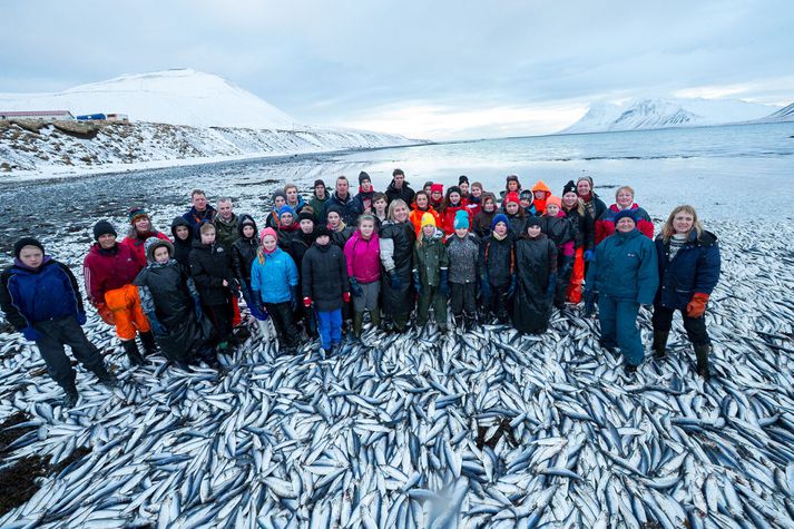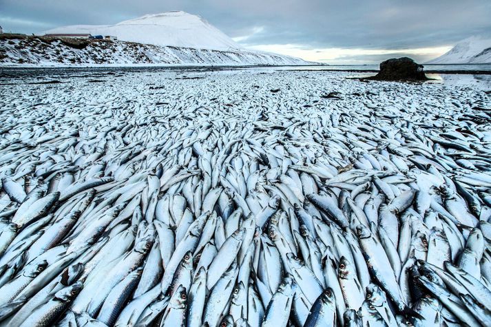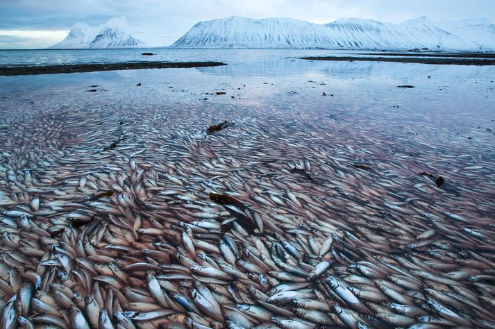 Þetta olli mikilli lífrænni mengun í firðinum, dauðum botndýrum á land í framhaldinu og drógu að sér tugþúsundir fugla og fjölda sjávarspendýra. Um fimmtíu manns, börn úr 5.-10. bekk í Grunnskóla Grundarfjarðar, félagar úr Ungmennafélagi Grundarfjarðar og einhverjir fullorðnir, fóru í Kolgrafafjörð þennan dag til að tína síld úr fjörunni. Síldin var síðan notuð í minkafóður sem selt var til Danmerkur. Sannkallaður síldarharmleikur. Vilhelm Gunnarsson ljósmyndari Vísi gerði sér ferð vestur á Snæfellsnes þennan dag og festi á filmu það sem fyrir augu bar. „Þetta var ótrúleg sjón sem blasti við, ég hafði aldrei séð neitt þessu líkt,“ rifjar Vilhelm upp og segist seint gleyma lyktinni sem fylgdi þessu gífurlega magni af rotnandi fiski. „Sem betur fer hafði ég tekið með mér auka föt og stígvél, og svartan ruslapoka sem ég gat hin fötin í og keyrt með heim, ef ég hefði ekki gert það hefði ég líklega skemmt bílinn út af lyktinni.“ Krakkarnir fengu átta krónur fyrir kílóið. Það sást þó ekki högg á vatni en áætlað var að rúm 35 þúsund tonn af síld hefðu drepist í firðinum.Vísir/Vilhelm Síldin var sett í kör og síðan í bíla.Vísir/Vilhelm Síldardauðinn vakti mikla athygli bæði innanlands og utan, en engin önnur dæmi hafa fundist um þvílíkt magn dauðrar síldar í náttúrunni, þótt fjölmörg tilvik megi finna um sjórekna síld hér og annars staðar í mun minna magni.Vísir/Vilhelm Ungir og aldnir komu saman og allir lögðu hönd á bóg.Vísir/Vilhelm Þessi drengur gerði sér lítið fyrir þegar stund var á milli stríða, og lagðist til hvílu ofan á fiskihrúgunni.Vísir/Vilhelm Eftir síldardauðann sóttu fuglarnir bæði í lifandi og dauða síld og streymdu inn á svæðið í tugþúsunda tali.Vísir/Vilhelm Orsök síldardauðans var súrefnisskortur en súrefnismettun sjávarins virðist hafa fallið vegna langvarandi kyrrviðris og mikils lífmagns í firðinum.Vísir/Vilhelm Fullorðnir og börn hjálpuðust að og unnu hörðum höndum allan daginn. Ekki ólíkt síldarævintýrunum í gamla daga en allt öðruvísi stemning enda tilefnið hundleiðinlegt.Vísir/Vilhelm Þessi mynd var tekin í lok dags en og sjá má var ennþá hellingur af síld eftir í fjörunni.Vísir/Vilhelm Að neðan má sjá fyrri greinar þar sem sagan er rifjuð upp með myndum Vilhelms Gunnarssonar ljósmyndara.