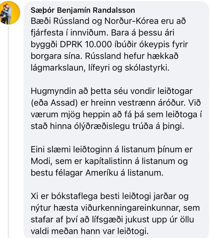 Tæpu einu og hálfu ári áður en hann var kjörinn formaður framkvæmdastjórnar Sósíalistaflokks Íslands á hitafundi í vor tók Sæþór Benjamín Randalsson til varna fyrir Kim Jong-un, einræðisherra Norður-Kóreu, Xi Jinping, forseta Kína og Vladímír Pútín, forseta Rússlands, á samfélagsmiðli. „Hugmyndin að þetta séu vondir leiðtogar (eða Assad) er hreinn vestrænn áróður. Við værum mjög heppin að fá þá sem leiðtoga í stað hinna ólýðræðislegu trúða á þingi,“ skrifaði Sæþór og bætti Bashar al-Assad, þáverandi forseta Sýrlands, við hópinn í athugasemd við færslu á því sem þá hét Sósíalistaspjallið á Facebook. Skjáskot af athugasemd Sæþórs Benjamíns Randalssonar við færslu um leiðtoga Kína, Rússlands og Norður-Kóreu á því sem hét þá Sósíalistaspjallið í september 2023.Skjáskot Þetta var í september árið 2023, einu og hálfu ári eftir allsherjarinnrás Rússa í Úkraínu. Rökstuddi Sæþór það meðal annars með því að bæði Rússland og Norður-Kórea fjárfestu í innviðum sínum fyrir landsmenn. „Xi er bókstaflega besti leiðtogi jarðar,“ skrifaði Sæþór ennfremur og vísaði til þess að lífsgæði hefðu aukist upp úr öllu valdi í stjórnartíð kínverska forsetans. Frá því að Sæþór og félagar tóku við völdum í Sósíalistaflokknum hafa þeir mært Kína og talað um að Íslendingar gætu lært margt af kínverska kommúnistaflokknum um hvernig ætti að bæta hag borgaranna. Einn stjórnenda flokksins ferðaðist einnig nýlega til Norður-Kóreu til að tala á hátíðarhöldum vegna afmælis Verkamannaflokksins sem fer með öll völd í landinu. Hann dásamaði í kjölfarið mikinn „uppgang“ í alræðisríkinu. Sami maður endurtók áróður Rússa um rætur innrásar þeirra í Úkraínu áður en hann ferðaðist á ráðstefnu í Sotsjí í Rússlandi í fyrra. Í viðtali við Vísi segist Sæþór ekki hafa áhyggjur af stöðu mannréttindamála utan Vesturlanda, hafnar því að stjórnarfar á Íslandi sé lýðræðislegt og segir að fjölmiðlar tali illa um ráðamenn í Kína, Rússlandi og Norður-Kóreu vegna þess að þeir gangi erinda bandarískrar heimsvaldastefnu. Vilja taka sér Kína til fyrirmyndar Bæði Sæþór og Karl Héðinn Kristjánsson, félagi hans í framkvæmdastjórn Sósíalistaflokksins, hafa verið gestir í kínverska sendiráðinu í Reykjavík á þessu ári og dásamað kínversk stjórnvöld á sama tíma. Sendiráðið er til húsa við hliðina á skrifstofum stéttarfélagsins Eflingar sem þeir hafa báðir starfað fyrir. Það vakti ekki sérstaklega mikla athygli þegar Sæþór greindi frá heimsókn sinni í kínverska sendiráðið í samfélagsmiðlafærslu um miðjan maí. Hann var þá stjórnarmaður í stéttarfélaginu Eflingu en var nokkrum dögum síðar kjörinn formaður framkvæmdastjórnar Sósíalistaflokksins. „Kína og afrek þess undir forystu [Kommúnista]flokksins hafa verið innblásandi að fylgjast með og erlendir sendiherrar þeirra, allir meðlimir flokksins, eru mjög fagmannlegir í starfi sínu. Ísland gæti lært margt af því hvernig á að beisla framleiðsluafl þjóðarinnar til að nota til að bæta hag allra borgara,“ skrifaði Sæþór við mynd af sér með He Rulong, kínverska sendiherranum. Sæþór með He Rulong, sendiherra Kína á Íslandi í kínverska sendiráðinu í maí, skömmu fyrir átakafund hjá Sósíalistaflokk Íslands þar sem Sæþór og félagar komust til valda.Sæþór Benjamín Randalsson Karl Héðinn lofaði einnig efnahagslegan árangur Kína í hástert í aðsendri grein á Vísi í október. „Á undanförnum áratugum hefur Kína náð árangri sem á sér fáar hliðstæður í sögunni. Kínverjum hefur tekist að lyfta yfir 800 milljónum manna úr fátækt, byggja upp öfluga innviði og þróa nýja tækni á fordæmalausum hraða. Þessi árangur sýnir að samstillt samfélag, með skýra langtímasýn í þágu almannahagsmuna, getur unnið söguleg afrek,“ skrifaði hann. Grein Karls Héðins birtist eftir að hann og Sæþór mættu í kínverska sendiráðið til að fagna 76 ára afmæli kínverska alþýðulýðveldisins og stjórnartíð kommúnistaflokksins. Á smáláni til Norður-Kóreu Kristinn Hannesson, einn fulltrúa í kosningastjórn Sósíalistaflokksins, vakti athygli í haust fyrir ferðalag sitt til Norður-Kóreu þar sem hann sótti málþing í tilefni áttatíu ára afmælis Verkamannaflokks landsins. Hann sagði Heimildinni að hann hefði tekið smálán til að fjármagna ferðina sem hefði ekki verið á vegum Sósíalistaflokksins. Hafnaði Kristinn því í viðtalinu við Heimildina að Norður-Kórea væri einræðisríki. „Mannréttindi eru ... Það eru alls konar ríki sem brjóta mannréttindi. Ísland brýtur mannréttindi í fangelsunum, við notum of mikla einangrunarvist. Ísrael fremur þjóðarmorð. En það sem er sagt er sagt án skoðunar. Fólk hefur ekki farið inn í landið og skoðað. Það er verið að notast við gamlar skýrslur,“ sagði Kristinn við Heimildina en hann er jafnframt aðalritari Vinafélags Íslands og Kóreu. Í fyrra ferðaðist Kristinn á ungmannaráðstefnu sem var haldin í Sotsjí í Rússlandi en Pútín ávarpaði hana meðal annars. Í viðtali við Karl Héðin á Samstöðinni endurtók Kristinn sjónarmið Rússa um innrásina í Úkraínu. Vestræn ríki bæru mikla ábyrgð á stríðinu, Úkraína væri krökk af nasistum og að þeir hefðu átt upphafið að mótmælunum miklu sem hröktu Viktor Janúkovitsj, bandamann Pútín, frá völdum árið 2014. Forvitnir um önnur kerfi en kapítalisma Sæþór segir í viðtali við Vísi að áhugi sósíalista á löndum eins og Kína og Norður-Kóreu skýrist af forvitni um hvernig öll kerfi heimsins vinni, ekki bara Kína heldur einnig Víetnam þar sem
