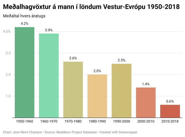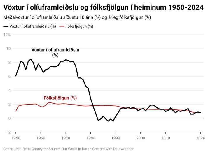 Í umræðu um kosti og galla þess fyrir Ísland að ganga í ESB er því gjarnan haldið fram að aðildarríki sambandsins séu að glíma við efnahagslega stöðnun eða jafnvel hnignun. Er þá vísað til þess að hagvöxtur innan sambandsins er lítill, atvinnuleysi hátt og samkeppnisstaða evrópskra fyrirtækja veik. Hér verður ekki tekin afstaða til þess hvernig „hagsmunum Íslands er betur borgið“ svo vísað sé í þennan alkunna frasa enda snýst þessi grein ekki um það. Hins vegar telur höfundur mikilvægt að áhugamenn um málið, hvað sem þeim finnst um ESB, átti sig á því hvaða öfl eru að verki í efnahagsþróun Evrópu. Það er vissulega sannleikskorn í sögunni um hnignun álfunnar. Um nokkurt skeið hefur ríkt ákveðin efnahagsleg stöðnun í mörgum Evrópulöndum. Kenningin fer hins vegar út af sporinu þegar kemur að því að greina orsök vandans, sem er ýmist sögð vera evran eða íþyngjandi regluverk sambandsins. Sú greining stenst ekki skoðun, af tveimur ástæðum. Í fyrsta lagi hafa hagvöxtur og atvinnuleysi verið mjög misjöfn í mismunandi löndum sambandsins. Á Ítalíu hefur til að mynda enginn hagvöxtur mælst síðustu 20 árin. Í Þýskalandi hefur hins vegar mælst 2-3% hagvöxtur og í Póllandi 3-5% (sem er mun meira en á Íslandi). Sömu sögu er að segja um atvinnuleysi, sem mælist nú aðeins 3,1% í Póllandi en 0,8% á Spáni. Ef ESB-samstarfið sem slíkt væri orsök efnahagslegrar stöðnunar mætti búast við svipaðri „stöðnun“ í öllum aðildarríkjum sambandsins, sem er ekki raunin. En ef stöðnunin er raunveruleg, að minnsta kosti í sumum löndum, hver eru þá orsök hennar? Myndritið hér fyrir neðan gefur mikilvæga vísbendingu: hagvöxtur virðist hafa byrjað að hægja á sér á svipuðum tíma í öllum helstu löndum ESB á fyrri hluta áttunda áratugarins. Á tímabilinu 1945-1973 mældist meðalhagvöxtur á mann í löndum sambandsins um 4%, en aðeins 2-2,5% næstu 25 árin á eftir, eða fram til ársins 2000. Á fyrstu 25 árum nýrrar aldar hefur hann síðan verið að hanga í kringum 1%. Einhvers konar vendipunktur virðist hafa orðið í kringum 1975. Aðrar mælingar staðfesta þennan vendipunkt enn frekar: um svipað leyti birtast tvær helstu plágur í efnahagskerfi margra Evrópuríkja, sem enn sér ekki fyrir endann á: hækkandi atvinnuleysi og sívaxandi skuldir ríkisins. En voru gerðar einhverjar grundvallarbreytingar á starfsemi sambandsins á þessum tíma sem gætu hugsanlega skýrt þennan vendipunkt? Svarið er nei. Evrópusambandið var stofnað fljótlega eftir síðari heimsstyrjöld og bjó þá við kröftugan hagvöxt. Engin afgerandi stefnubreyting varð á áttunda áratugnum sem getur útskýrt skyndilega hnignun hagvaxtarins. Gerðist eitthvað annað sem gæti útskýrt þessa þróun? Já, sannarlega. Árið 1973 varð svokölluð olíukreppa þegar olíuframleiðsla í heiminum dróst skyndilega saman. Eftir um 70 ár af nánast samfelldum vexti í olíuframleiðslu varð skyndilegur skellur eftir að olíuvinnsla Bandaríkjanna fór að hnigna og olíuríkjum í Miðausturlöndum tókst að semja sín á milli um að hemja eigin framleiðslu til að halda uppi hærra olíuverði. Framleiðslan dróst fyrst saman um 5% árið 1973 og síðan um 15% árið 1979. Þessum olíukreppum fylgdi mikil verðbólga, háir vextir og efnahagssamdráttur. Þær marka því sögulegan vendipunkt fyrir efnahagskerfi heimsins. Myndritið hér fyrir neðan sýnir þetta glöggt: á árunum 1950 til 1973 jókst olíuframleiðsla um 6-8% árlega (ritið sýnir meðalvöxt síðustu 10 ára), langt umfram fólksfjölgun sem var um 2% á ári. Þessi vöxtur hrynur hins vegar skyndilega niður um og eftir 1973. Hann tekur aðeins við sér á tíunda áratugnum en fer að hnigna aftur hægt or rólega eftir 2008 og kemst sjaldan yfir 1% eftir það, sem rétt dugar til að halda í við fólksfjölgun. En hvort er eggið og hvort er hænan, gæti glöggur lesandi spurt. Getur ekki verið að minni vöxtur heimshagkerfisins sé orsökin, og minni olíuframleiðsla afleiðingin, frekar en öfugt? Tvær mikilvægar vísbendingar benda til þess að framboð af orku, og sér í lagi olíu, sé takmarkandi þáttur fyrir vöxt hagkerfisins. Í fyrsta lagi er erfitt að útskýra hnignandi hagvöxt öðruvísi. Hvernig má vera að Evrópulönd sem virtust hafa fundið töfrauppskrift að hagvexti hafi skyndilega „týnt“ henni og öll byrjað að taka rangar efnahagsákvarðanir á nákvæmlega sama tíma? Þetta virðist enn ólíklegra þegar haft er í huga að í þessum löndum hafið verið mjög ólíkar ríkisstjórnir við völd, sumar vinstrisinnaðar, aðrar hægrisinnaðar, og allt þar á milli. Við þetta bætist að hnignandi hagvöxtur einskorðast ekki við Vestur-Evrópu. Hann er líka vel sýnilegur í öðrum iðnríkjum svo sem Bandaríkjunum og Japan. Á árunum eftir síðari heimsstyrjöld mældist hagvöxtur í Bandaríkjunum 4-5%, en á síðustu árum hefur hann verið í kringum 1-2%. Á sama tíma hafa skuldir ríkisins náð sögulegu hámarki. Svipuð þróun og svipuð tímasetning í svo mörgum löndum bendir til þess að orsökin sé hnattræn og kerfisbundin frekar en afleiðing af „rangri“ efnahagsstjórnun í einstaka ríkjum. Þar að auki eru margar vísbendingar um að olíuiðnaðurinn sé að rekast á sífellt fleiri hindranir þegar kemur að því að viðhalda, hvað þá auka, olíuframleiðslu. Síðan 2013 hefur fjárfesting í olíuleit dregist saman og nýir olíufundir verða sífellt rýrari. Jafnframt verða bæði olíuleit og -vinnsla sífellt kostnaðarsamari, áhættusamari og tæknilega flóknari. En hvers vegna fjalla svo fáir fræðimenn og stjórnmálamenn um þessi tengsl hagvaxtar og olíuframleiðslu? Algeng ranghugmynd um olíuiðnaðinn er sú að olíuverð á hver