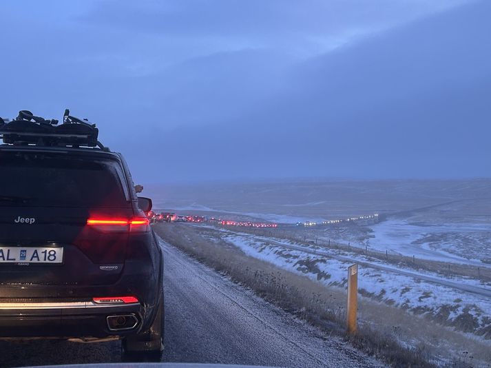 Gular veðurviðvaranir eru í gildi til klukkan 23 á norðvesturhorni landsins og hefur fjöldi fólks lent í umferðaróhappi. „Við biðjum ALLA um að halda sig heima og fara alls ekki af stað,“ skrifar lögreglan í færslu á Facebook en viðbragðsaðilar hafa haft í nógu að snúast í dag þar sem norðanhríð skekur landið. Þar kemur enn fremur fram að unnið sé að fjöldahjálparstöð Rauða krossins verði opnuð í íþróttahúsinu á Blönduósi. Vegargerðin greinir frá því að vegkaflanum hafi verið verið lokað að beiðni lögreglu og að ólíklegt þyki að vegirnir opni aftur í kvöld. Lögreglan hefur lokað þessum vegkafla.Já.is „Fyrir þá sem eru í Staðarskála á leiðinni suður er verið að moka Laxárdalsheiði og verður fært þar yfir fljótlega,“ segir í færslu á umferðarvef Vegagerðarinnar. Fyrr í dag fór rúta út af vegi á Holtavörðuheiði. Talsmaður Landsbjargar segir að á annan hundrað björgunarmanna hafi verið ræstir út vegna veðurst síðasta tæpa sólarhring. Bílaröðin úr norðurátt að Staðarskála síðdegis í dag.Vísir/Oddur Fréttin hefur verið uppfærð.