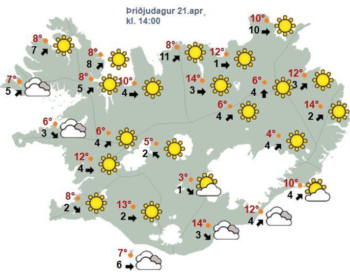 Á vef Veðurstofunnar segir að í dag og fram á miðvikudagskvöld sé þó útlit fyrir strekking- eða allhvassan vind norðvestanlands og á Tröllaskaga, en hvassast verður á Ströndum. „Nú fyrir hádegi þykknar upp vestanlands og útlit er fyrir þokuloft þar fram eftir kvöldi, en annars verður bjartviðri í öðrum landshlutum fram á fimmtudag þegar tekur að þykkna upp sunnanlands. Hiti getur víða náð allt að 16 til 18 stigum að deginum. Á föstudag veldur háþrýstisvæði yfir N Grænlandi fremur hægum norðaustlægum áttum og þá gæti kólnar heldur norðan- og austanlands,“ segir í hugleiðingum veðurfræðings. Spákort fyrir klukkan 14.Veðurstofan Veðurhorfur á landinu næstu daga Á miðvikudag: Suðvestan 10-18 m/s um landið norðvestanvert, annars 5-13. Víða léttskýjað, en skýjað og líkur á þokulofti vestantil. Hiti 5 til 18 stig að deginum, hlýjast suðaustanlands. Á fimmtudag (sumardagurinn fyrsti): Vestlæg eða breytileg átt 3-8 m/s. Skýjað með köflum og yfirleitt þurrt vestanlands og við suðurströndina, annars bjart að mestu. Hiti 5 til 13 stig yfir daginn, hlýjast suðaustantil. Á föstudag: Norðan og norðaustan 3-10 m/s, þykknar upp og kólnar norðanlands. Stöku skúrir með ströndinni, en bjart með köflum og áfram milt sunnan heiða. Á laugardag: Suðlæg átt, 3-10 m/s. Dálítil súld með köflum sunnan- og vestantil en annars skýjað með köflum. Hiti 4 til 12 stig að deginum, hlýjast á Vesturlandi. Á sunnudag: Útlit fyrir suðaustlæga átt og rigningu með köflum, en yfirleitt þurrt norðaustanlands. Hiti breytist lítið. Á mánudag: Útlit fyrir fremur hægar og mildar suðlægar áttir og rigningu, en úrkomuminna norðaustanlands.