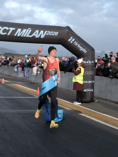 Baldvin og Andrea fögnuðu sigri í fyrsta míluhlaupinu Ágúst Orri Arnarson skrifar 29. apríl 2026 07:58 Baldvin Þór og Andrea eru 250.000 krónum ríkari eftir sögulegan sigur. vecct / aron guan Baldvin Þór Magnússon og Andrea Kolbeinsdóttir stóðu upp sem sigurvegarar í sögulegu hlaupi í gærkvöldi, þegar fyrsta Íslandsmeistaramótið í götumílu fór fram á Kvartmílubrautinni í Hafnarfirði. Hlaupin var ein míla, eða 1.609 metrar, á hraðri og flatri braut. Hringurinn var 1.119 metrar með tveimur 490 metra beinum köflum. Aðstæður voru afar erfiðar, verulega vindugar og votar. Hlaupararnir voru því ekki að klukka sína bestu tíma en sigurvegararnir voru ekki óvæntir. Baldvin Þór kom í mark á 4:21. vecct / aron guan Baldvin Þór Magnússon vann karlaflokkinn með því að hlaupa míluna á 4 mínútum og 21 sekúndu. Jökull Bjarkason og Fjölnir Brynjarsson urðu í 2. og 3. sæti, báðir á tímanum 4:31. Andrea Kolbeinsdóttir vann kvennaflokkinn með því að hlaupa míluna á 4 mínútum og 59 sekúndum. Halldóra Huld Ingvarsdóttir og Íris Anna Skúladóttir urðu í 2. og 3. sæti, á 05:11 og 05:20. Andrea kom í mark á 4:59.vecct / aron guan Einnig var keppt í opnum almennum flokkum karla og kvenna. Þar var Agnar Darri Sveinsson sigurvegari karla á tímanum 04:49 en Sigrún Erla Lárusdóttir sigurvegari kvenna á tímanum 05:52. Keppnin bar heitið Vecct Mílan og var í beinni útsendingu á Vísi. Upptaka verður birt hér fyrir neðan síðar í í dag. Hlaup Mest lesið Guardiola sá langþráða endurkomu Benonýs Breka Enski boltinn Þórsarar gætu hætt: „Fyrir hvern erum við að standa í þessu starfi?“ Körfubolti Gremja í City-mönnum sem spila þrjá leiki á sjö dögum Enski boltinn Lygileg níu marka veisla í París Fótbolti Metfjöldi marka í undanúrslitum: Sjáðu veisluna sem fór fram í París Fótbolti Dagskráin í dag: Stjarnan með sóp á Króknum og Arsenal slæst við Atlético Sport „Stórkostlegur varnarleikur“ í níu marka veislu Fótbolti Baldvin og Andrea fögnuðu sigri í fyrsta míluhlaupinu Sport Þristur í lokin og Sindri eða Breiðablik í Bónus-deildina Körfubolti Ipswich sigri frá sæti í ensku úrvalsdeildinni Enski boltinn Fleiri fréttir Beint rautt spjald fyrir að hylja munninn á HM Baldvin og Andrea fögnuðu sigri í fyrsta míluhlaupinu Metfjöldi marka í undanúrslitum: Sjáðu veisluna sem fór fram í París Guardiola sá langþráða endurkomu Benonýs Breka Dagskráin í dag: Stjarnan með sóp á Króknum og Arsenal slæst við Atlético Gremja í City-mönnum sem spila þrjá leiki á sjö dögum Þórsarar gætu hætt: „Fyrir hvern erum við að standa í þessu starfi?“ „Stórkostlegur varnarleikur“ í níu marka veislu Þristur í lokin og Sindri eða Breiðablik í Bónus-deildina Uppgjörið: Haukar - Keflavík 86-70 | Haukar unnu sannfærandi sigur og komust yfir Lygileg níu marka veisla í París Ipswich sigri frá sæti í ensku úrvalsdeildinni Arnar Freyr öflugur í evrópskum Íslendingaslag Diljá fljót að leggja upp fyrir mikinn Íslandsvin Uppgjörið: ÍBV - Haukar 36-31 | Eyjakonur tryggðu sér sæti í úrslitum Hver verður fljótastur að hlaupa míluna? Modric brotinn en ætti að ná HM Skíðin komin í skúrinn „Ætlarðu að halda í hugmyndafræðina eða reyna að ná í úrslit?“ Stones rifar seglin hjá City Besta sætið: Rauð flögg hjá Stjörnunni Anton Ari í Kópavogi til 2028 „Þetta eru tvö bestu lið Evrópu“ Stjörnurnar fá frí gegn Egyptum Klúður Koo bjargaði lífi hestaþjálfara Illa farið með Þórsara: „Þetta er bara rangt“ Arnór Ingvi ætti að vera klár fyrir Valsleikinn Gerði umdeilda skiptingu: „100 prósent pirraður og ég skil hann vel“ Reglum um gul spjöld á HM verði breytt Sjáðu öll 26 mörkin úr Bestu deildinni í gær Sjá meira